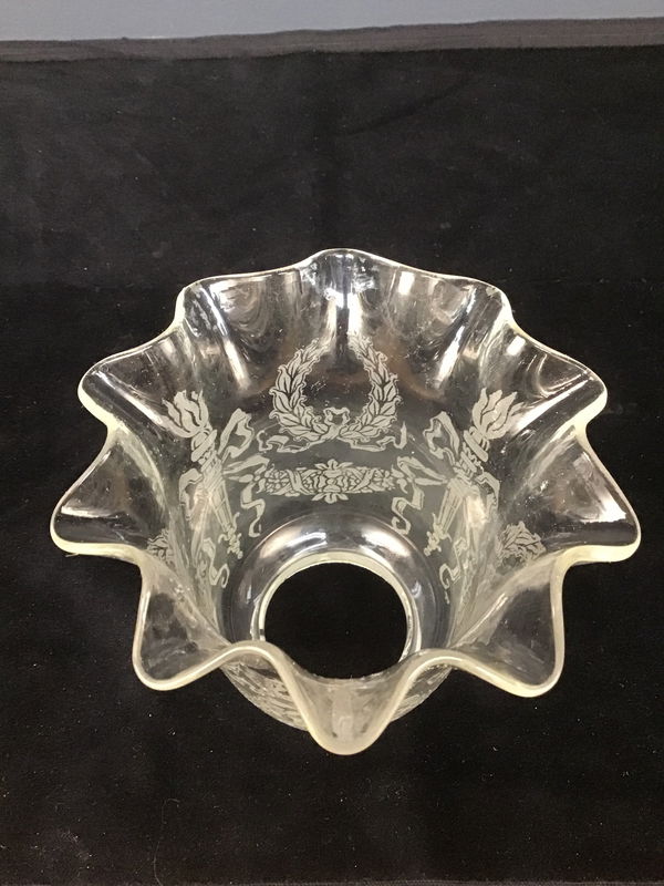 A beautiful antique etched glass shade with a storch and laurel wreath pattern for a gas/electric light fixture.