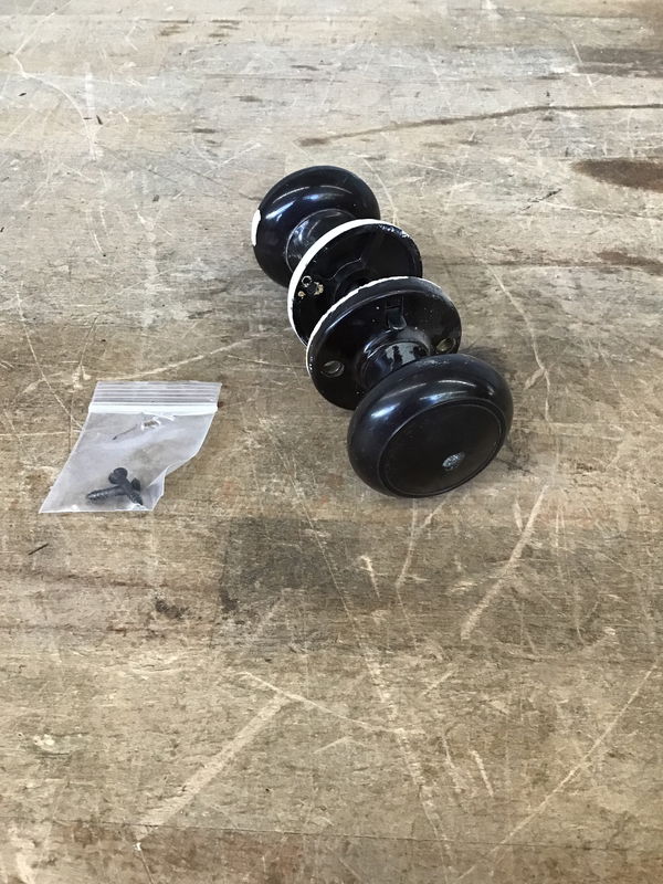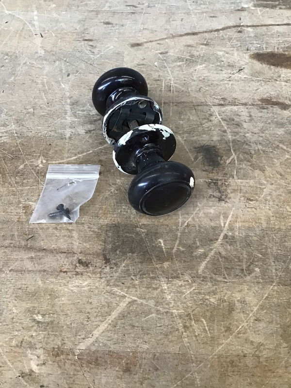 Vintage dark brown bakelite knobset with just a bit of paint to be cleaned off. This comes with spindle, set screws, escutcheons and even a few (tho not all) screws.