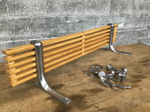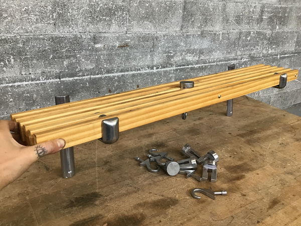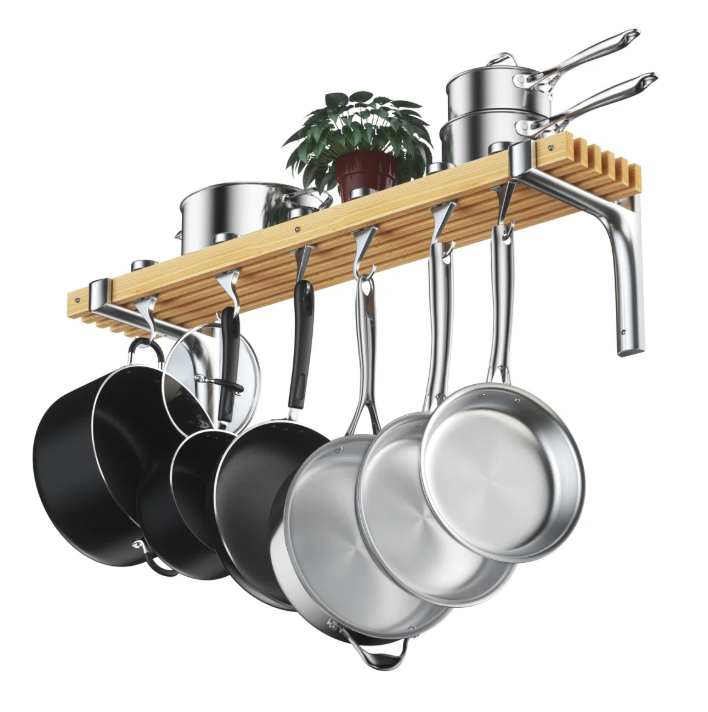 Neat pot rack that features a wood slatted shelf and aluminum hardware. The two wall brackets are cast aluminum and the shelf slides right onto them securely, no need for additionally hardware. The pot hooks all slide in through the top with a neat little puzzle anchor. Ready for your 36" range! Full product specs available here.