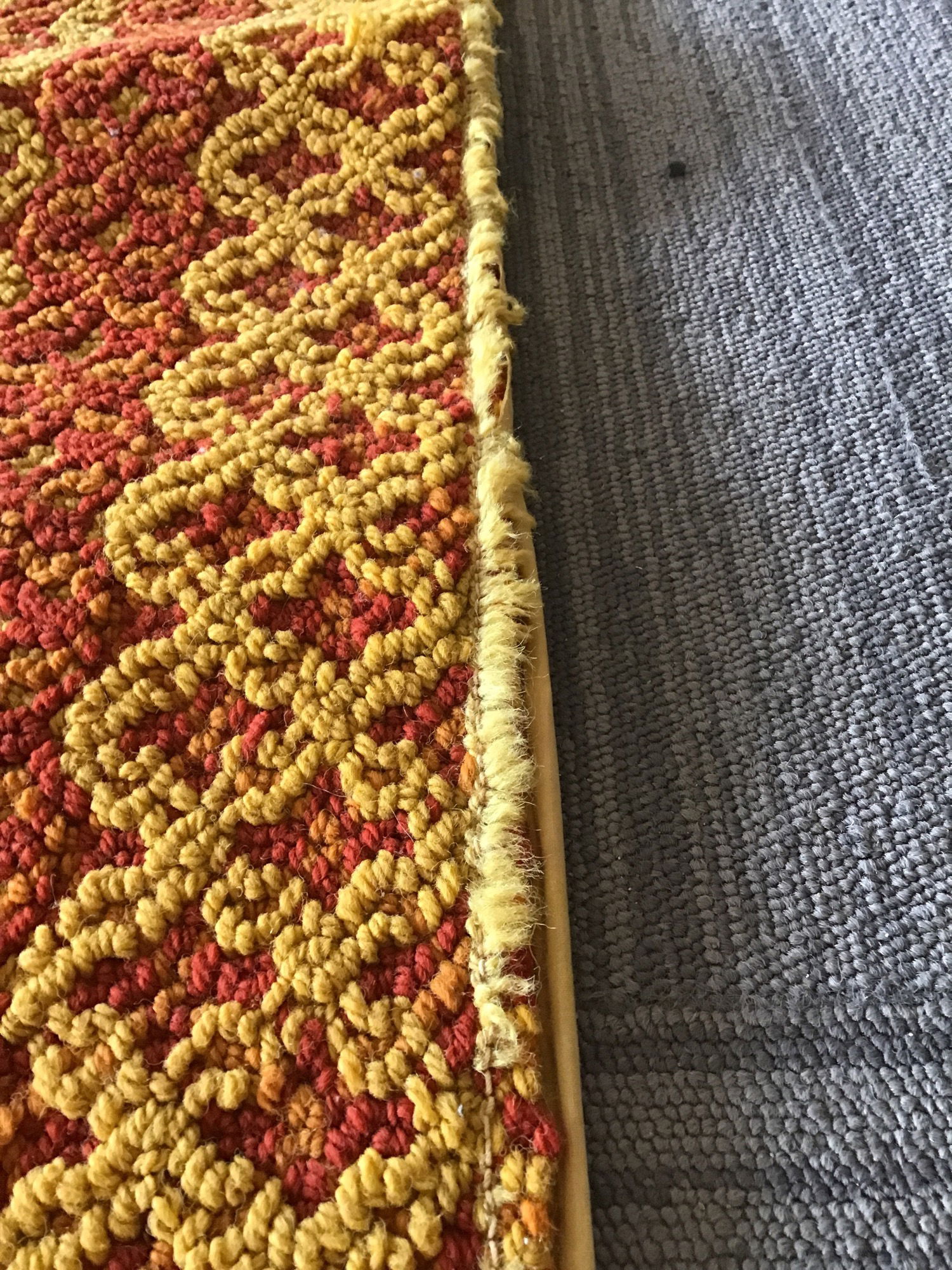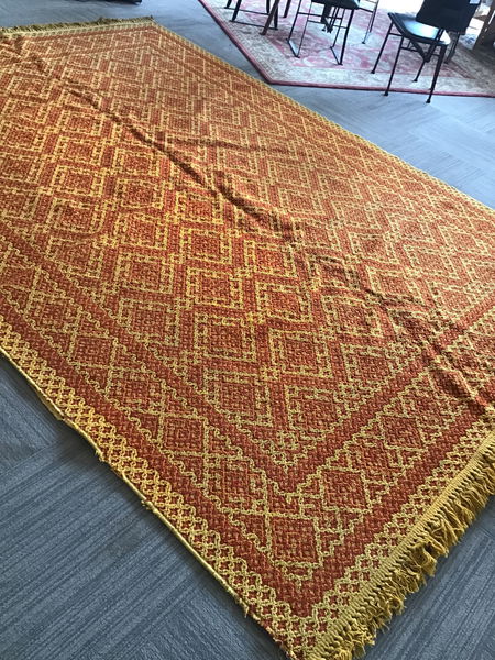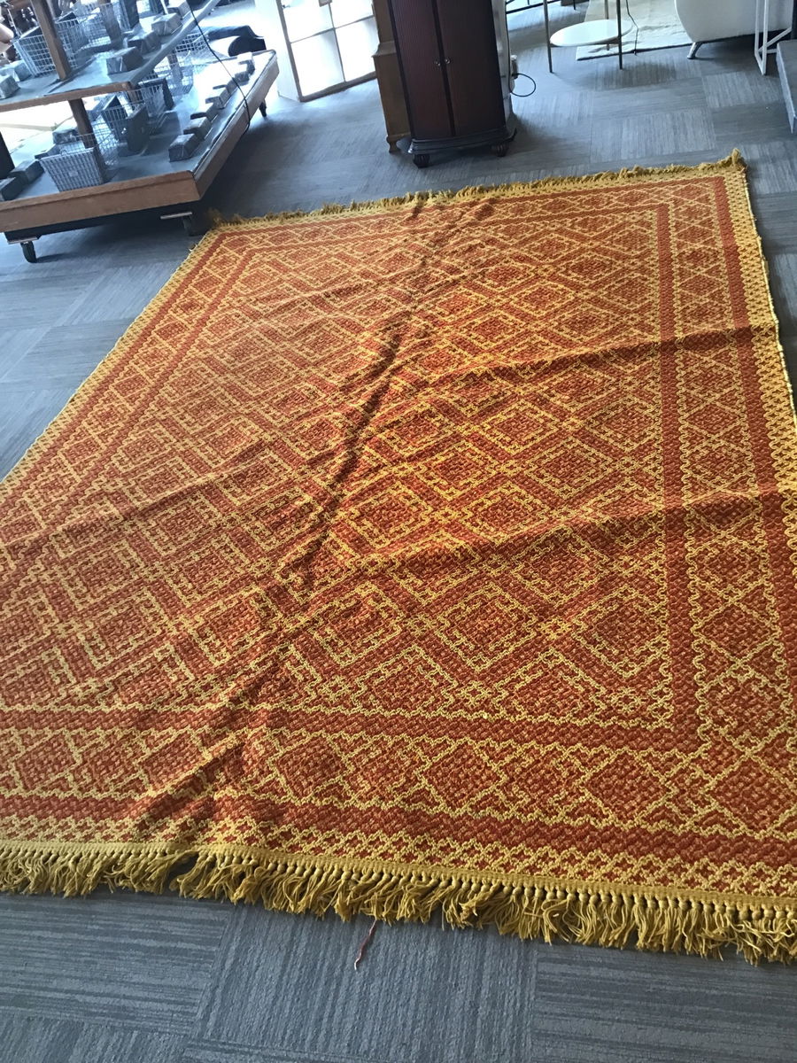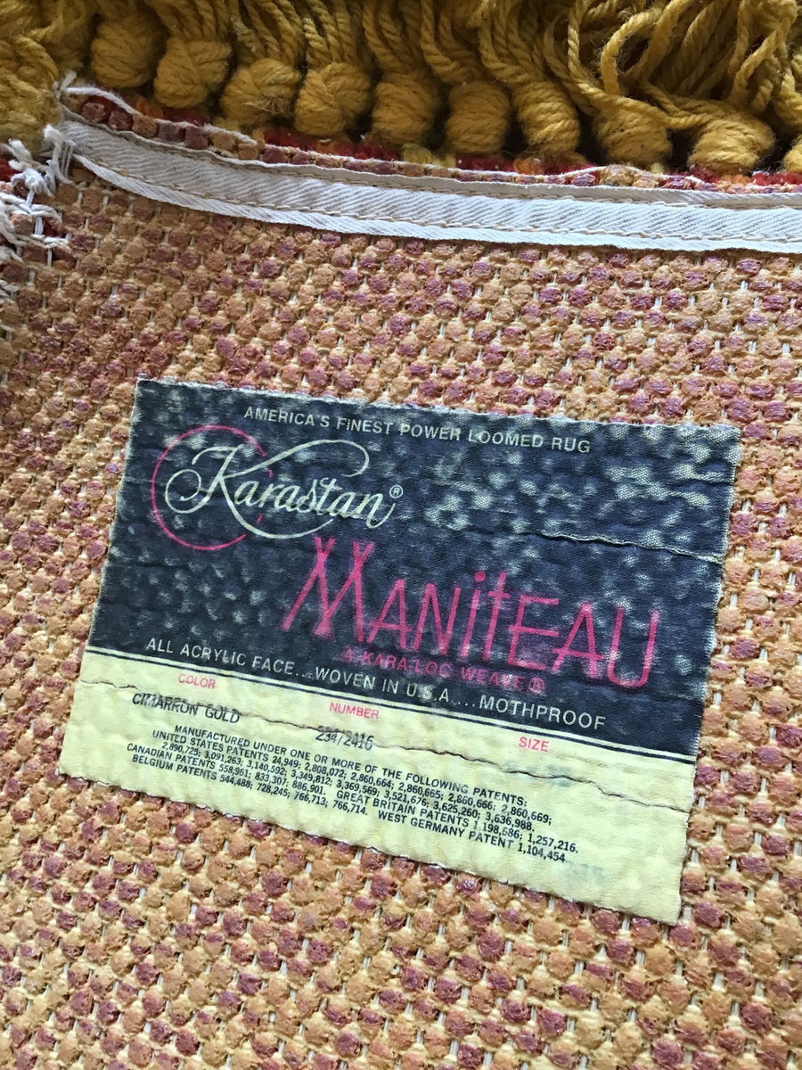 This (guessing) 1960's Karastan "Maniteau" acrylic rug comes to us with its original tag on the back. It's the "Cimarron Gold" color & #234/2416. Both edges show a fair amount of fraying and wear, but the colors are still quite striking. Length listed does not include the tassels.