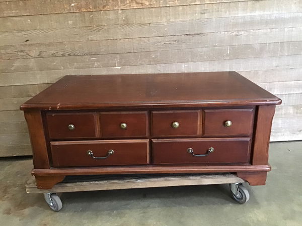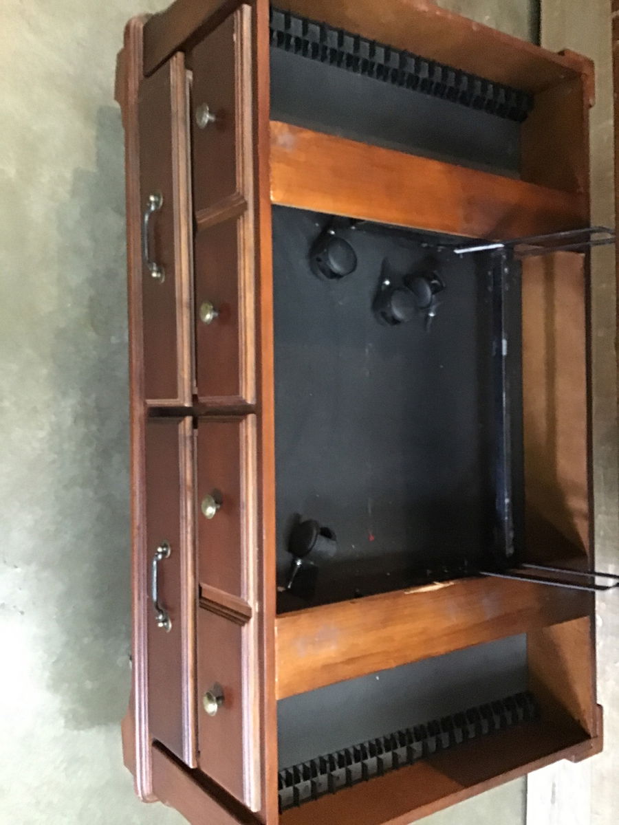 Looks to have separators for storing DVD and VHS hidden under a liftable hinged top. Cool little cabinet that would make a great storage cabinet for media or devices.