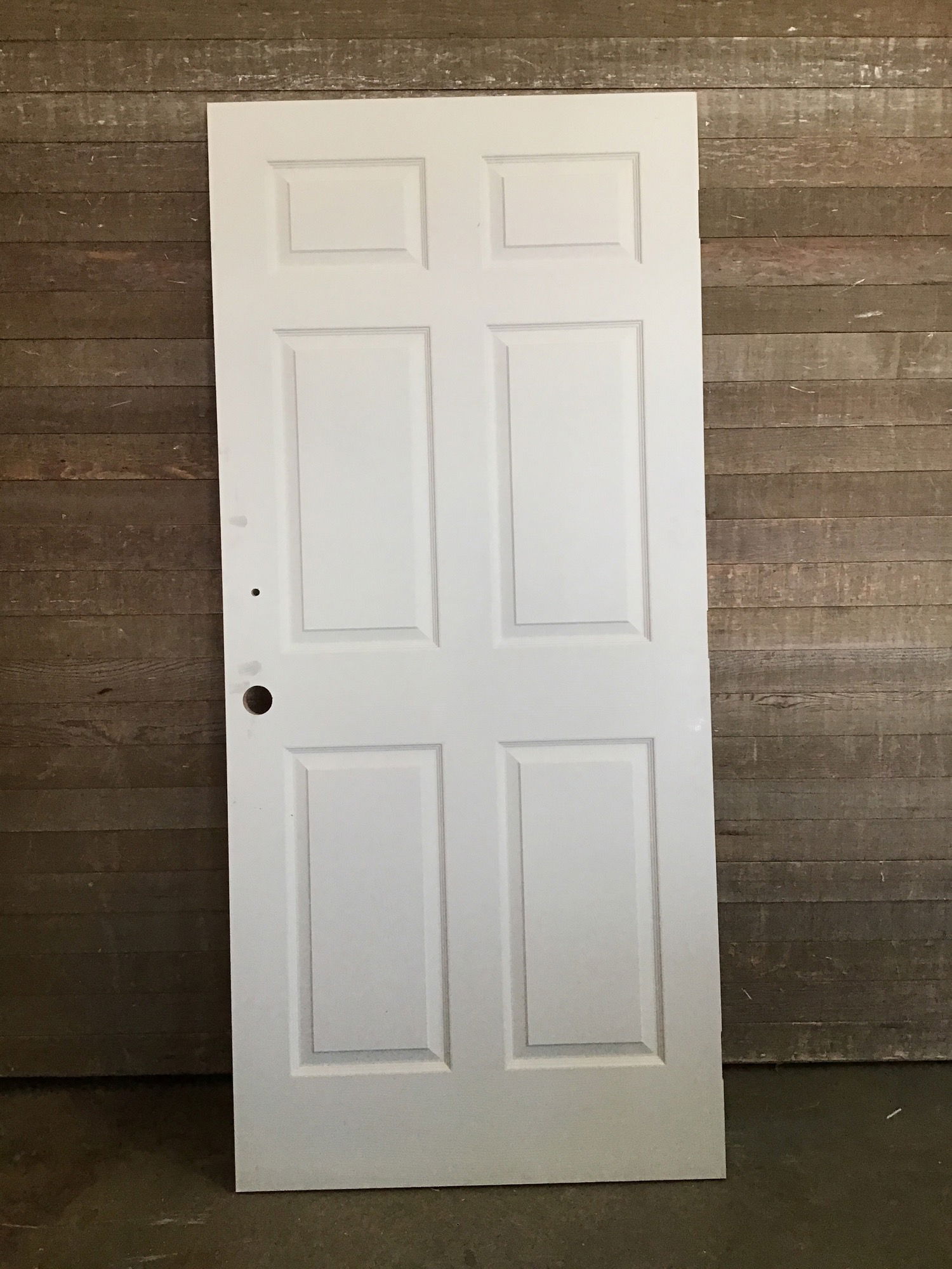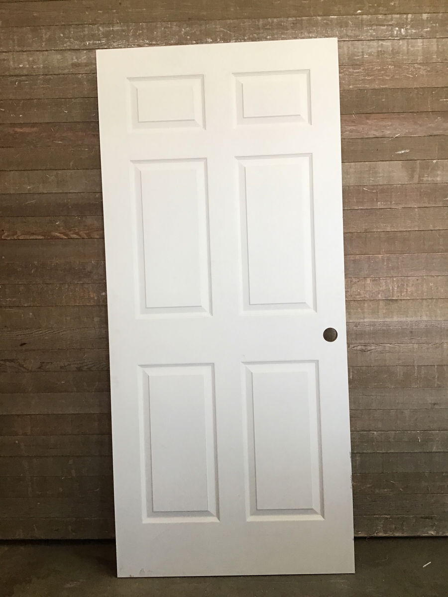 Never installed, 36" hollow core panelled door with faux wood grain. Has a small hole cutout above its bore cuts and has left hand swing hinge cuts.