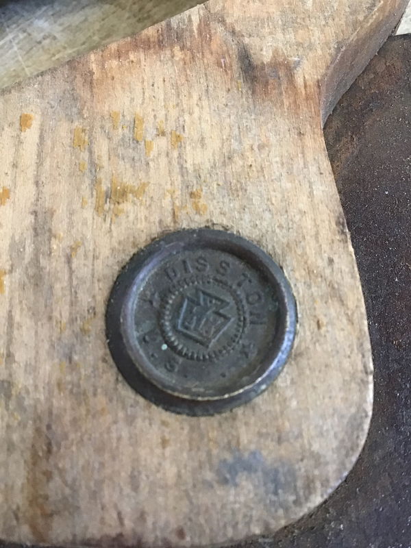 The handle is marked Disston, so I'm assuming this rusty miner's saw (coarse teeth with a long blade) was made by same company.
