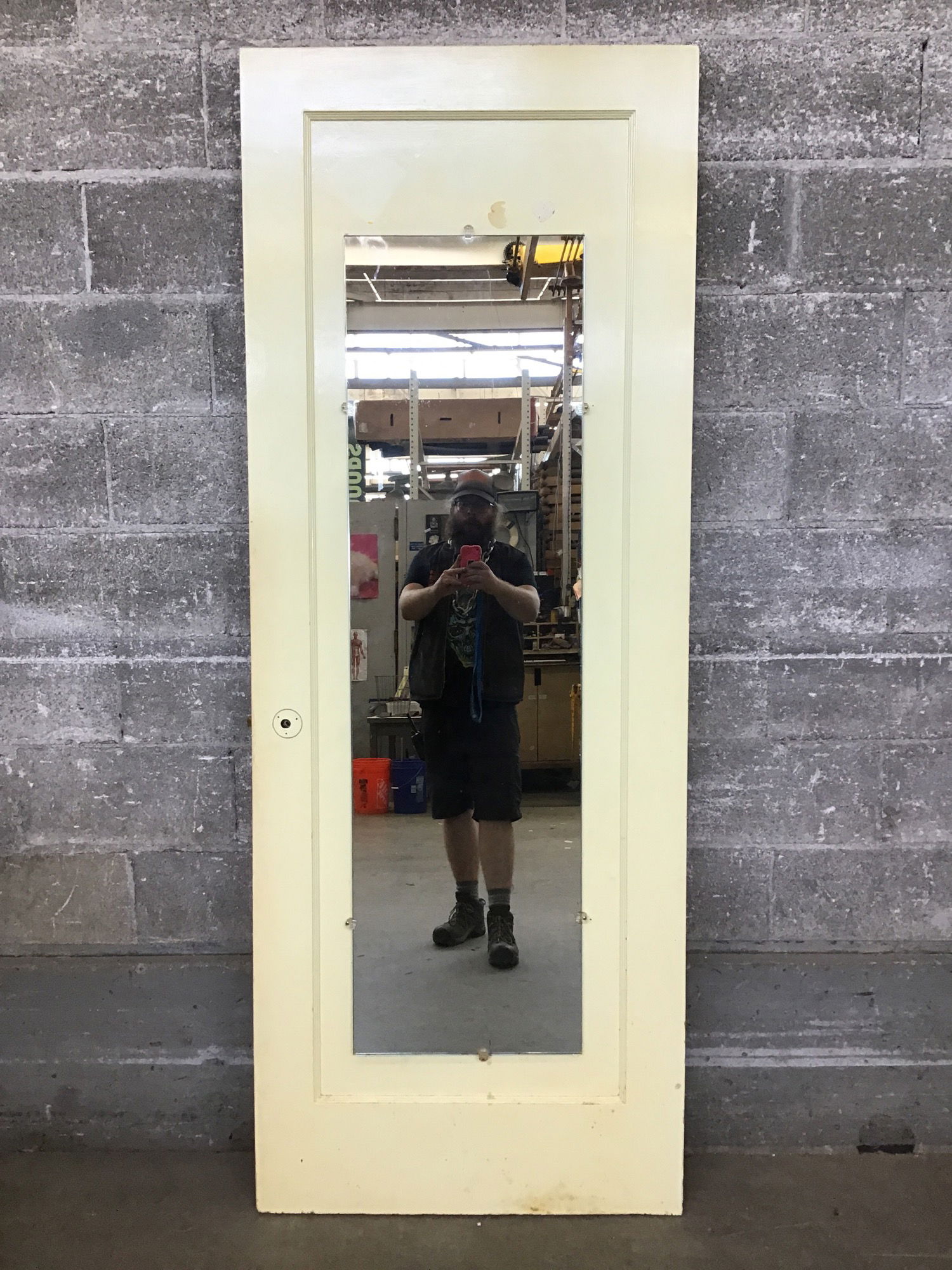 RH swing Single Panel Interior Door. Has a mirror mounted on one side.