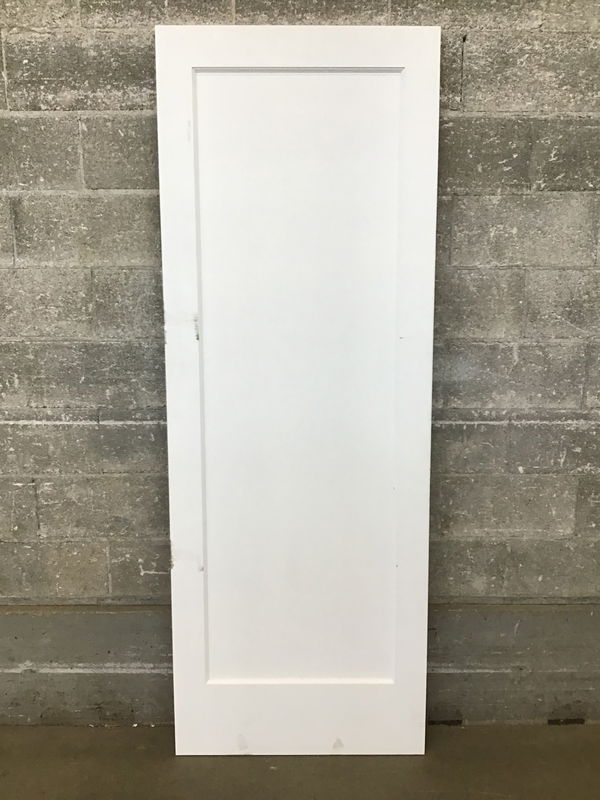 This undrilled for hinges, primed masonite, recessed one panel interior door was narrowed proportionally at the door shop to 29". Item may have cosmetic damage.