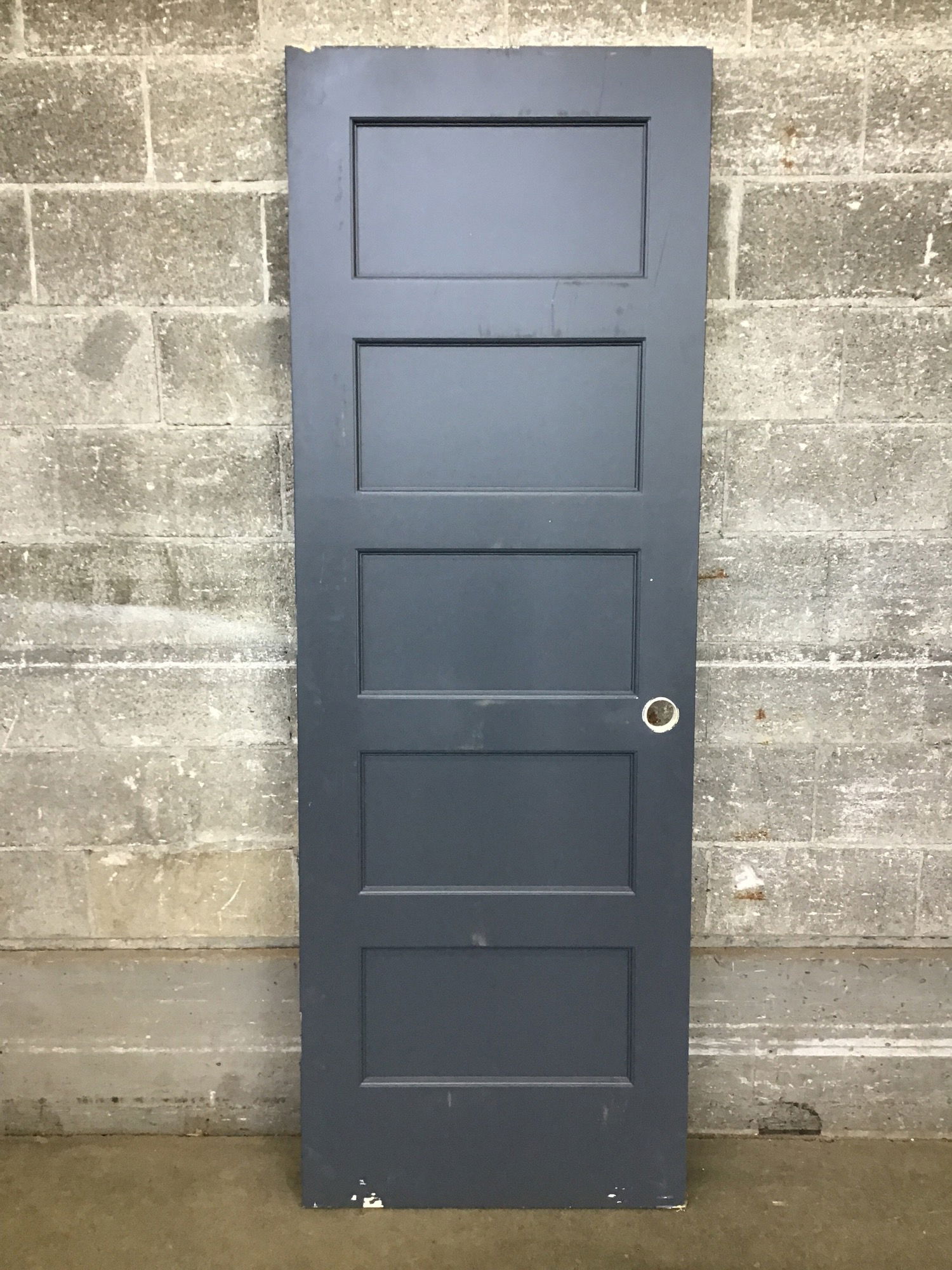 Beautiful, barely used, five-panel interior door slab with crisp professional paint job (slate gray on one side) and standard hardware hole for modern knobset of your choice. This door is ready to go, just needs jamb and hardware.