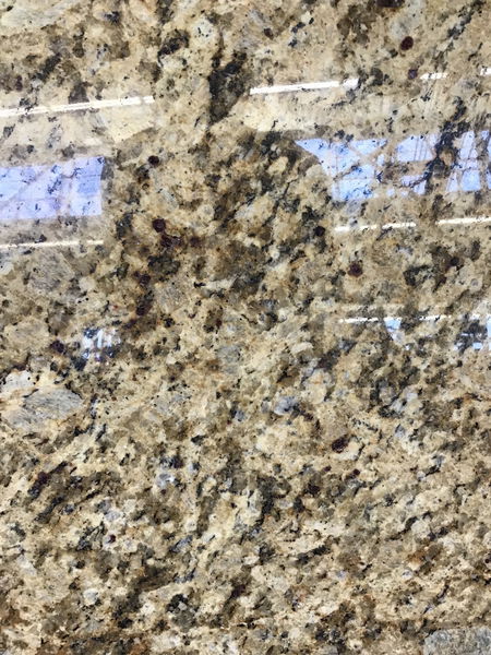 Tan granite with garnets, with two white oval undermount sinks.