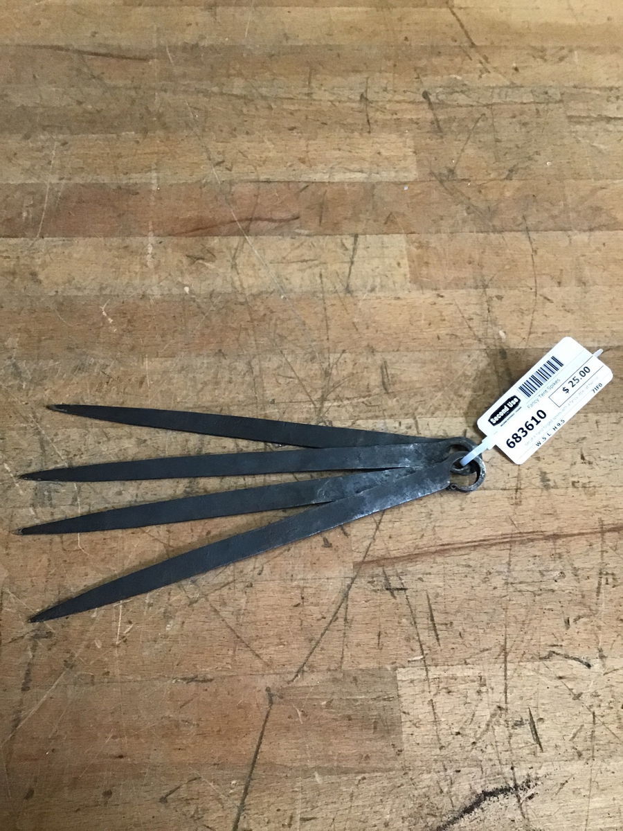 Set of 4 hand forged spikes with a fancy little rat twirl loop at the end. Probably meant to be used as tent spikes. They're a great length for it anyway.