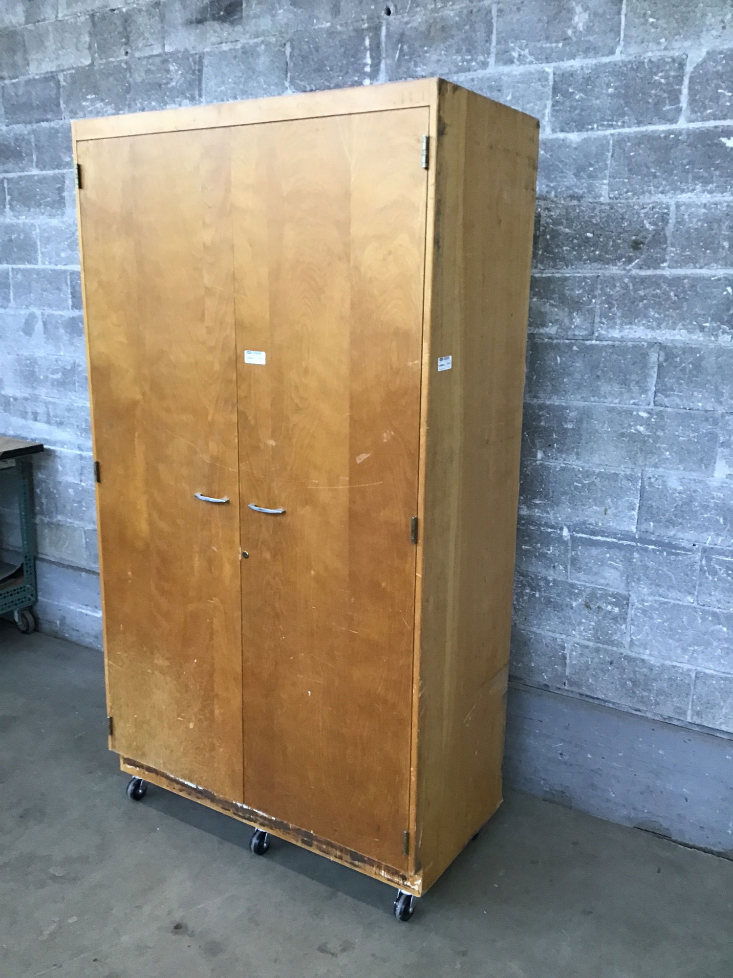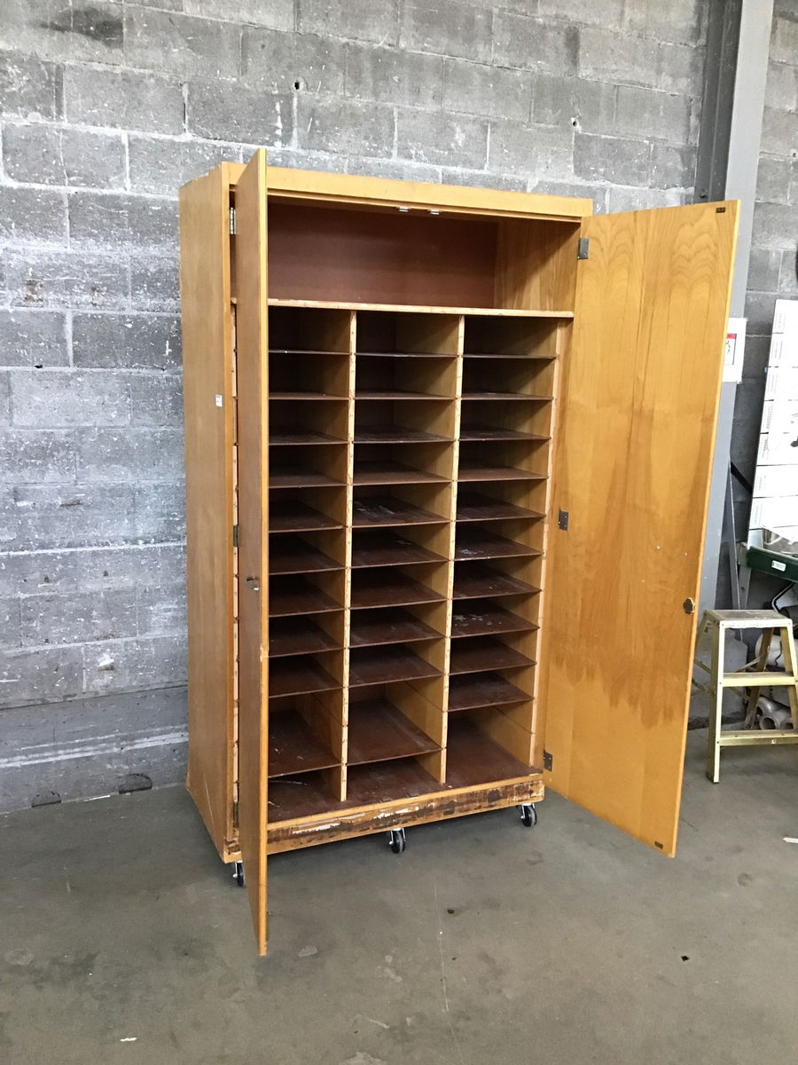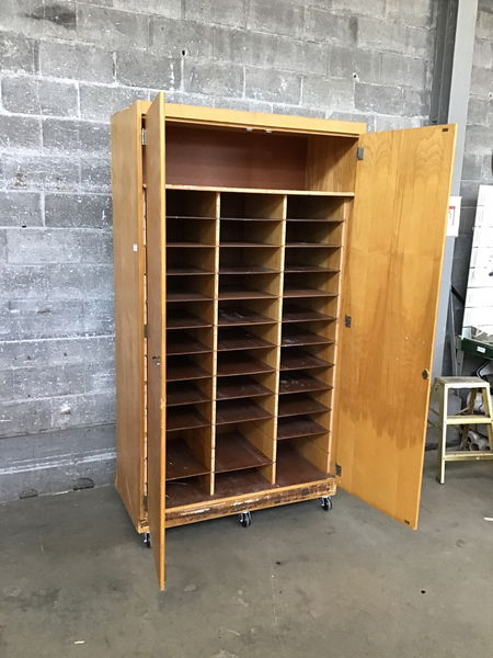 Looks like birch veneer on this awesome homemade shop cabinet with a ton of modular shelves, 13 tiers in all. The plastic face on each shelf is cracking away which tells us this cabinet has some age to it. It also has its own wheels which is pretty useful.