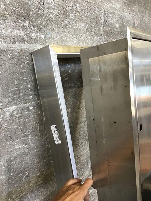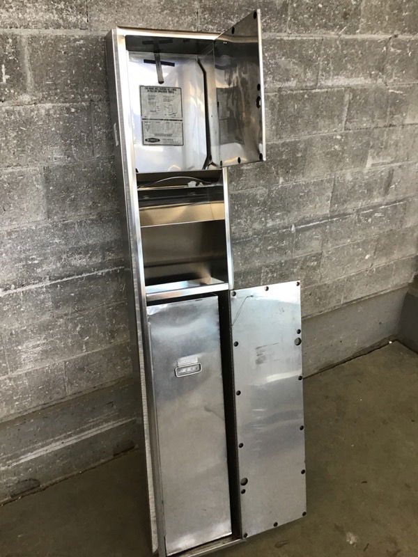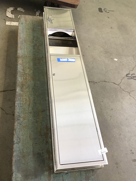 Stainless steel, recessed in wall paper towel dispenser and trash can unit. This one has locks and one key. Price reflects. Second and third photos are representational.