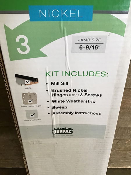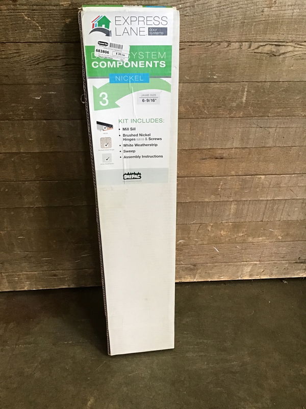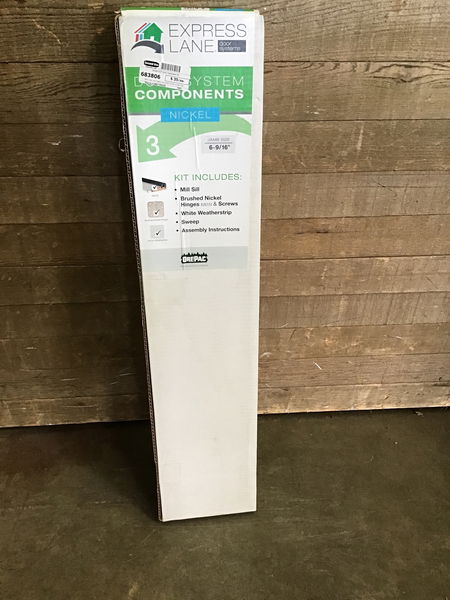 New in box, door system components kit with a nickel finish. This fits 6-9/16" jamb size doors. Kit includes: mill sill, brushed nickel hinges & screws, white weatherstrip, sweep, and assembly instructions. Photo may be representational.