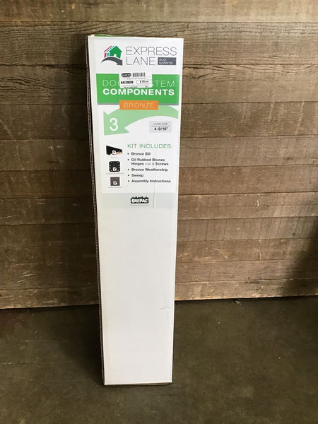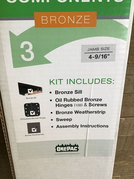 New in box, door system components kit with a bronze finish. This fits 4-9/16" jamb size doors. Kit includes: bronze sill, oil rubbed bronze hinges & screws, bronze weatherstrip, sweep, and assembly instructions. Photo may be representational.