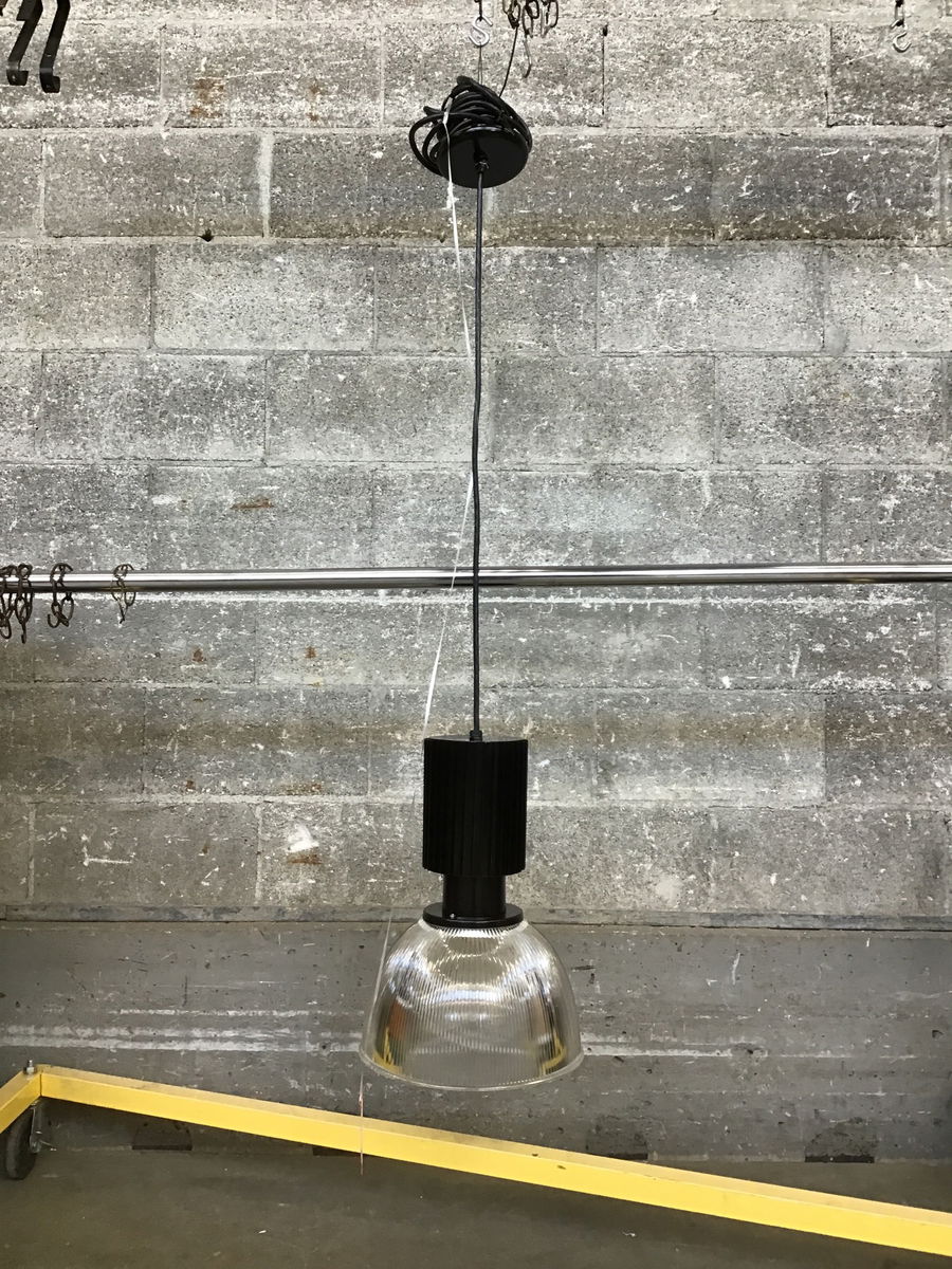 Baselite indutrial style light with plastic holophane shade. This light includes a huge amount of cord, at least 10' to accomodate a variety of needs. Sample photo was assembled from a box, other lights available are new in box.