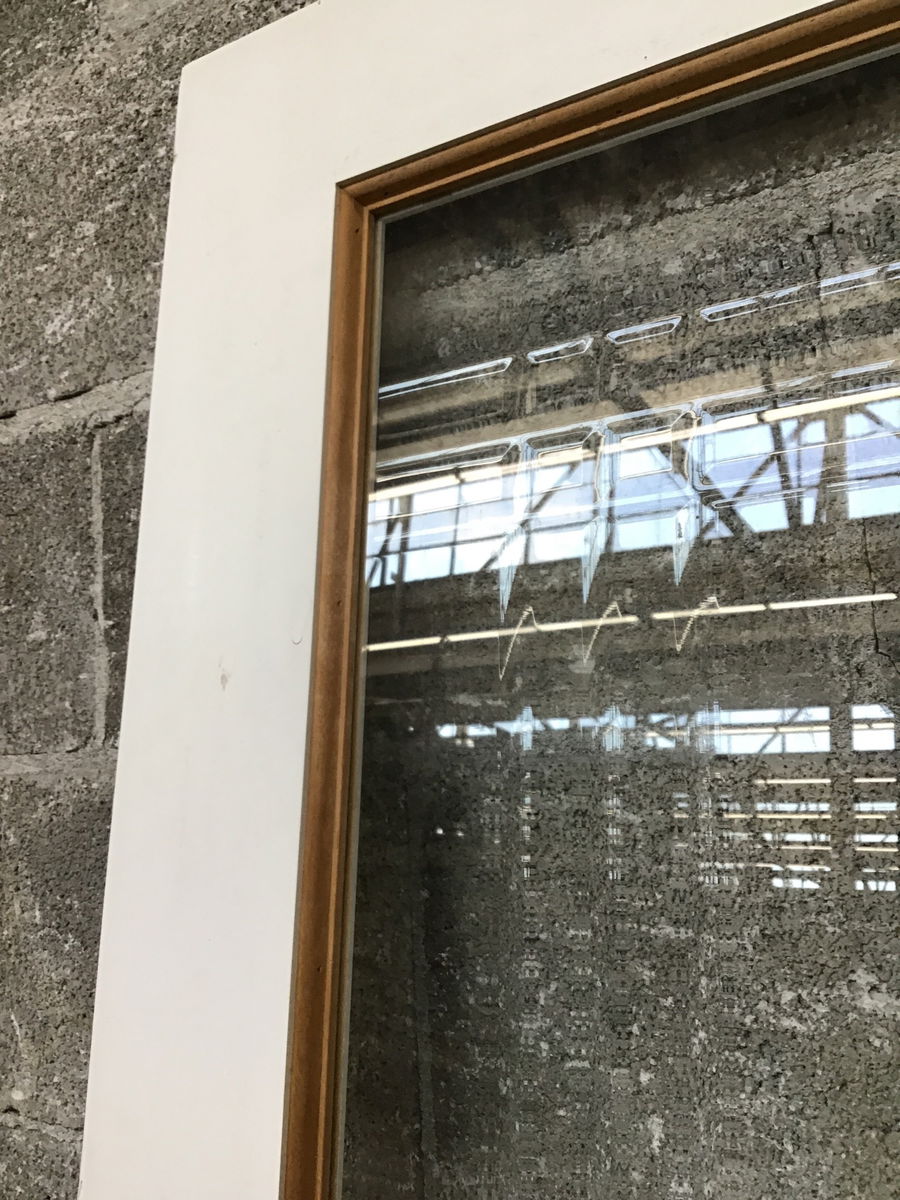 This white interior door features a full lite with a unique beveled detail. This would look great as an inside entry way door, door to kitchen