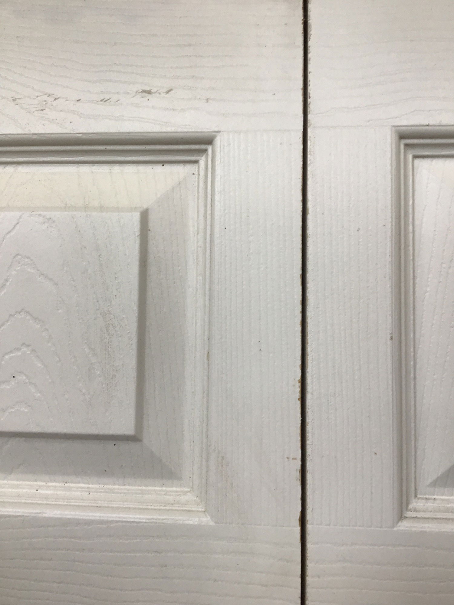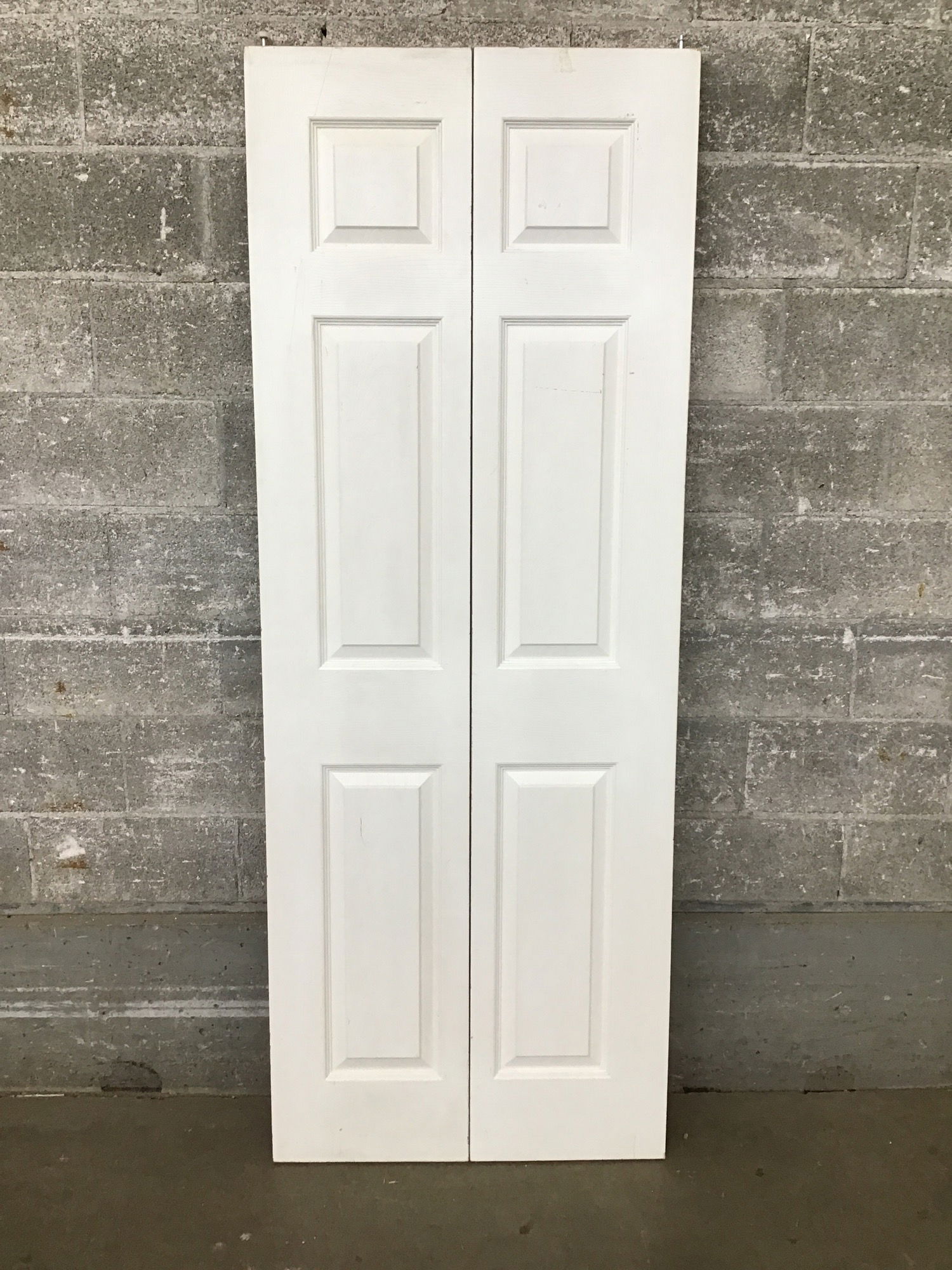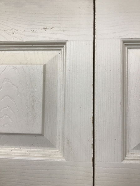 Faux wood grain, faux six panel, hollow core bifold door.