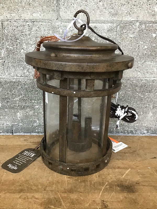 This three bulb chain pendant light from Maxim Lighting came to us new in the box. It's taken out for photos and display. Although the side of the box has 30039CDSE on it, this looks like the 3138 CDSE "Santa Barbara" outdoor hanging lantern that sells online for $288.