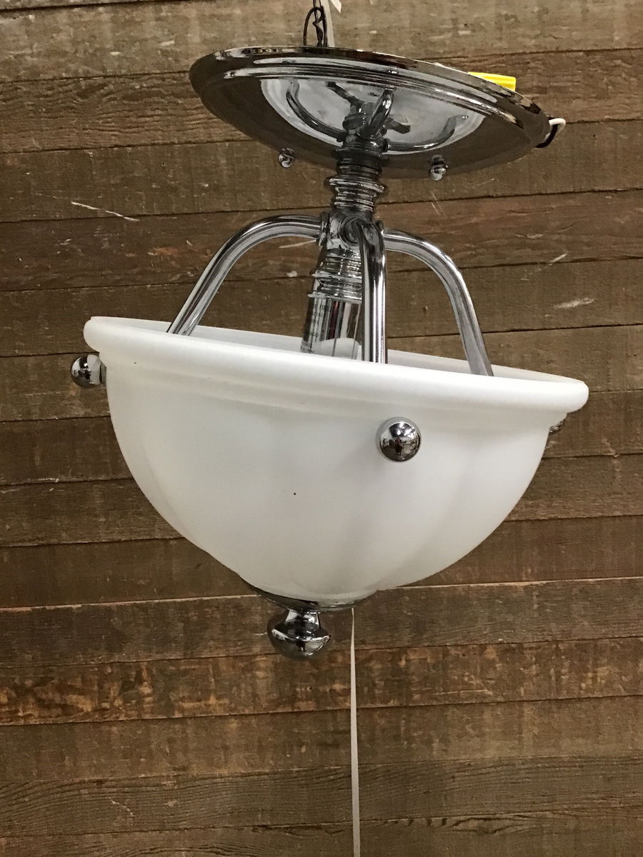 Shiny upside down bell glass shade with polished chrome body. In good used shape.