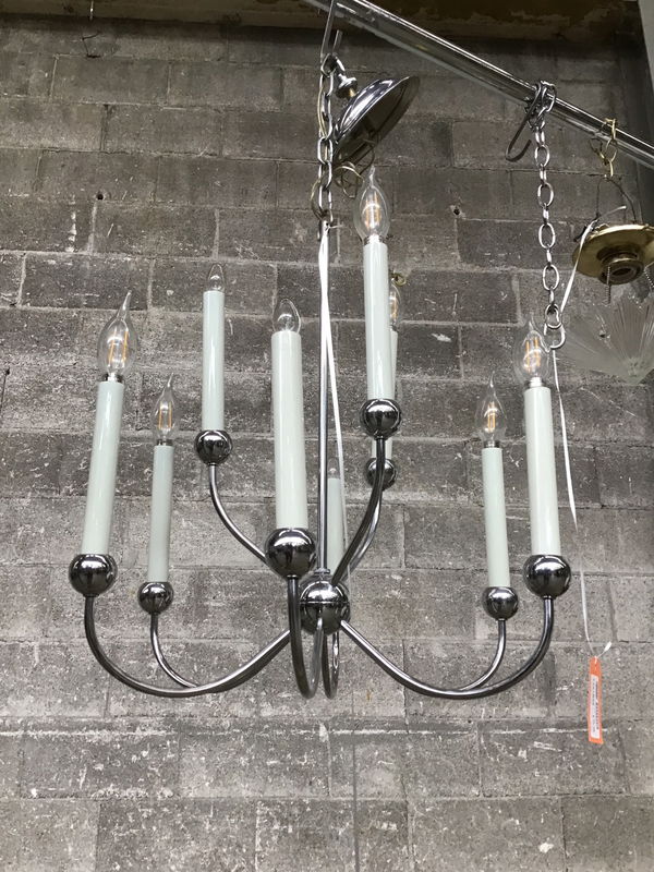 9-bulb Sputnik-esque pendant light with a polished chrome finish.