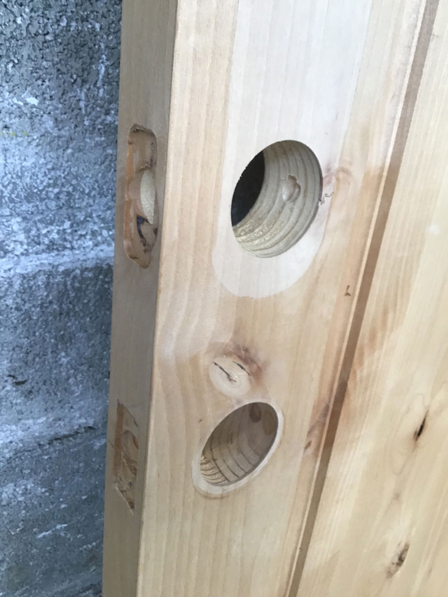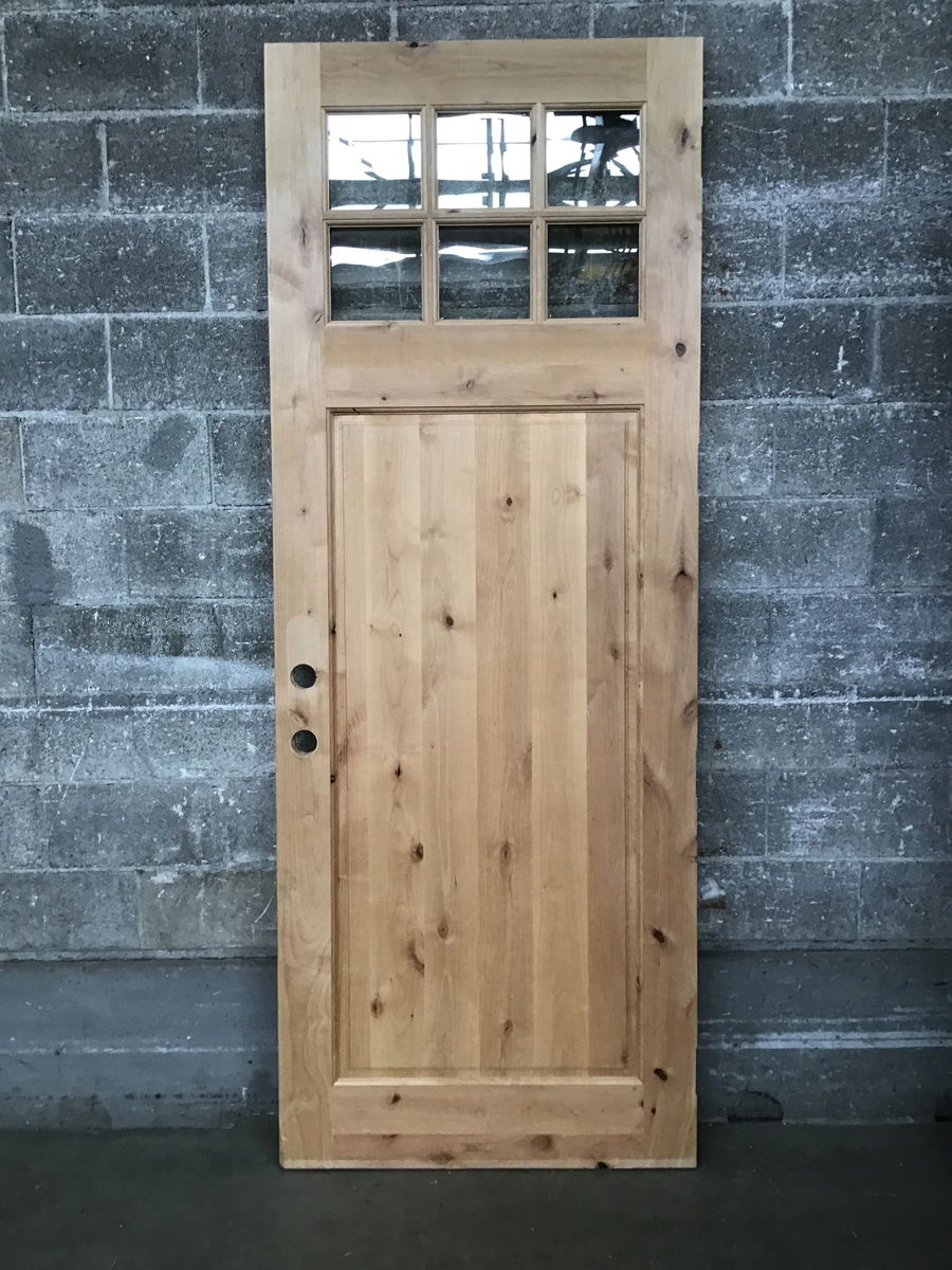 Unfinished knotty alder, raised single panel with six insulated glass lites up top. Made by Rogue Valley Door. Guessing this is about a $1500 door on the retail market.