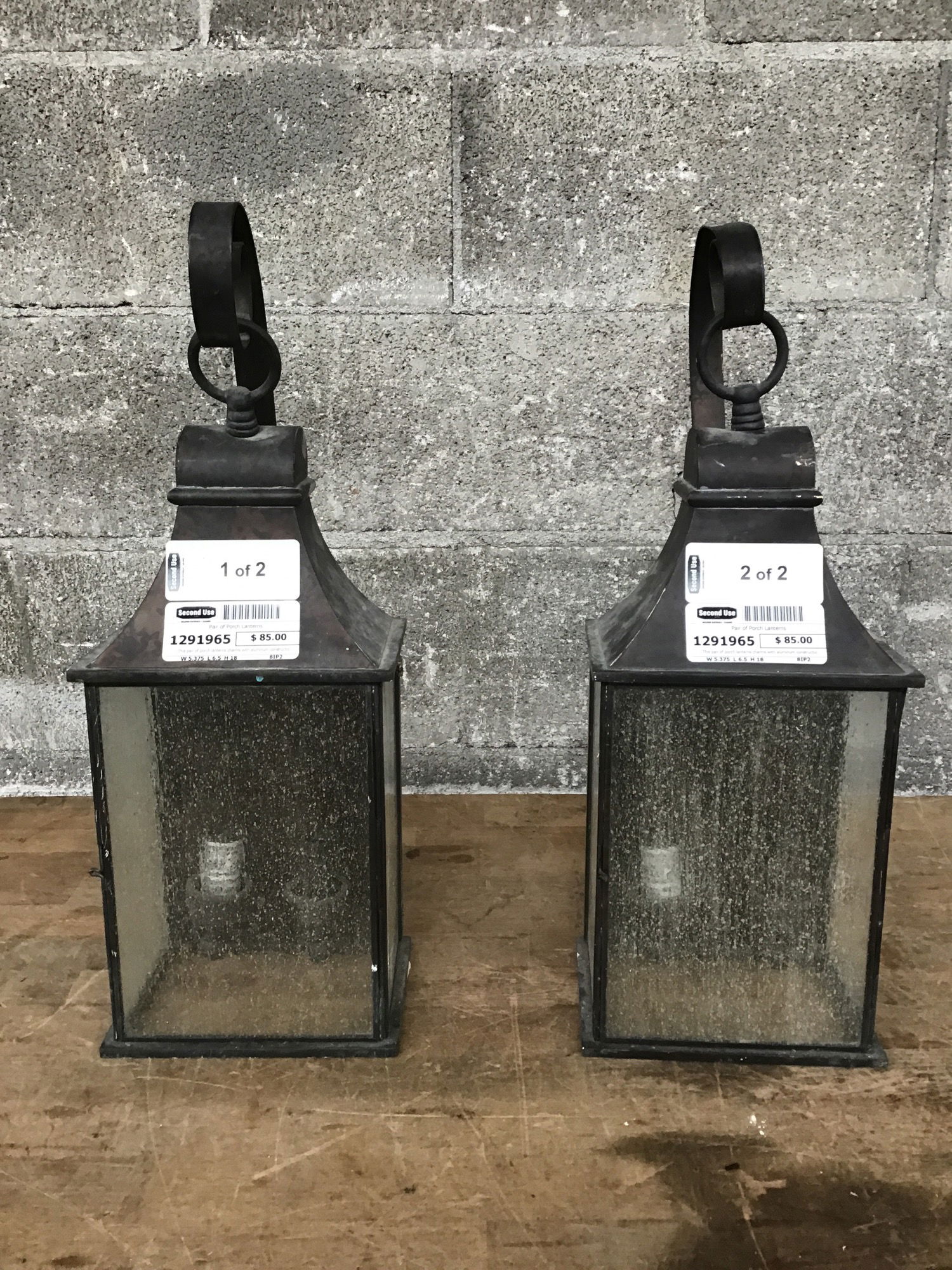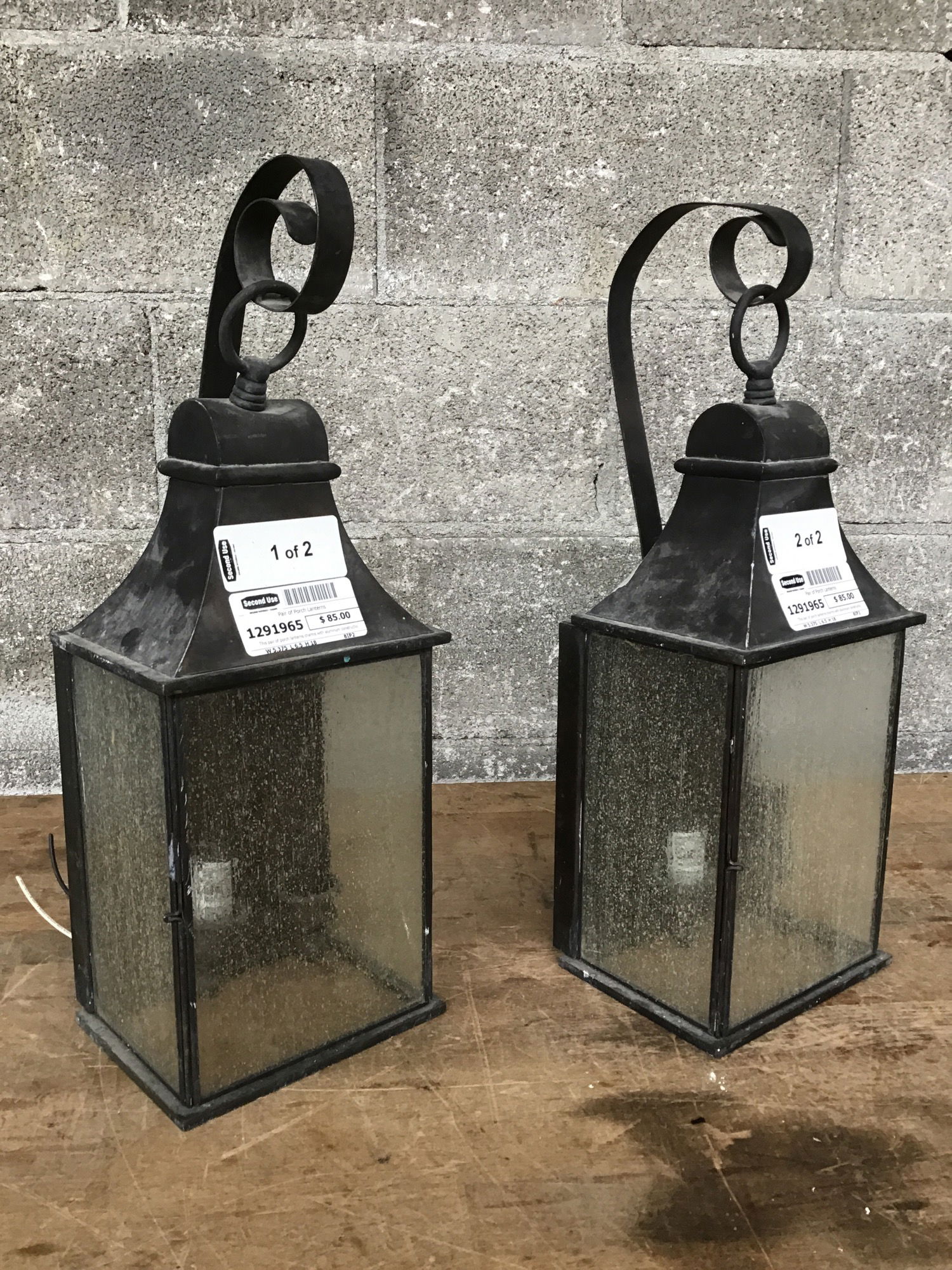 This pair of porch lanterns charm with aluminum construction, sea glass panes, two sockets each, and easy-open lantern doors. Some paint here and there, and subtle scratches.