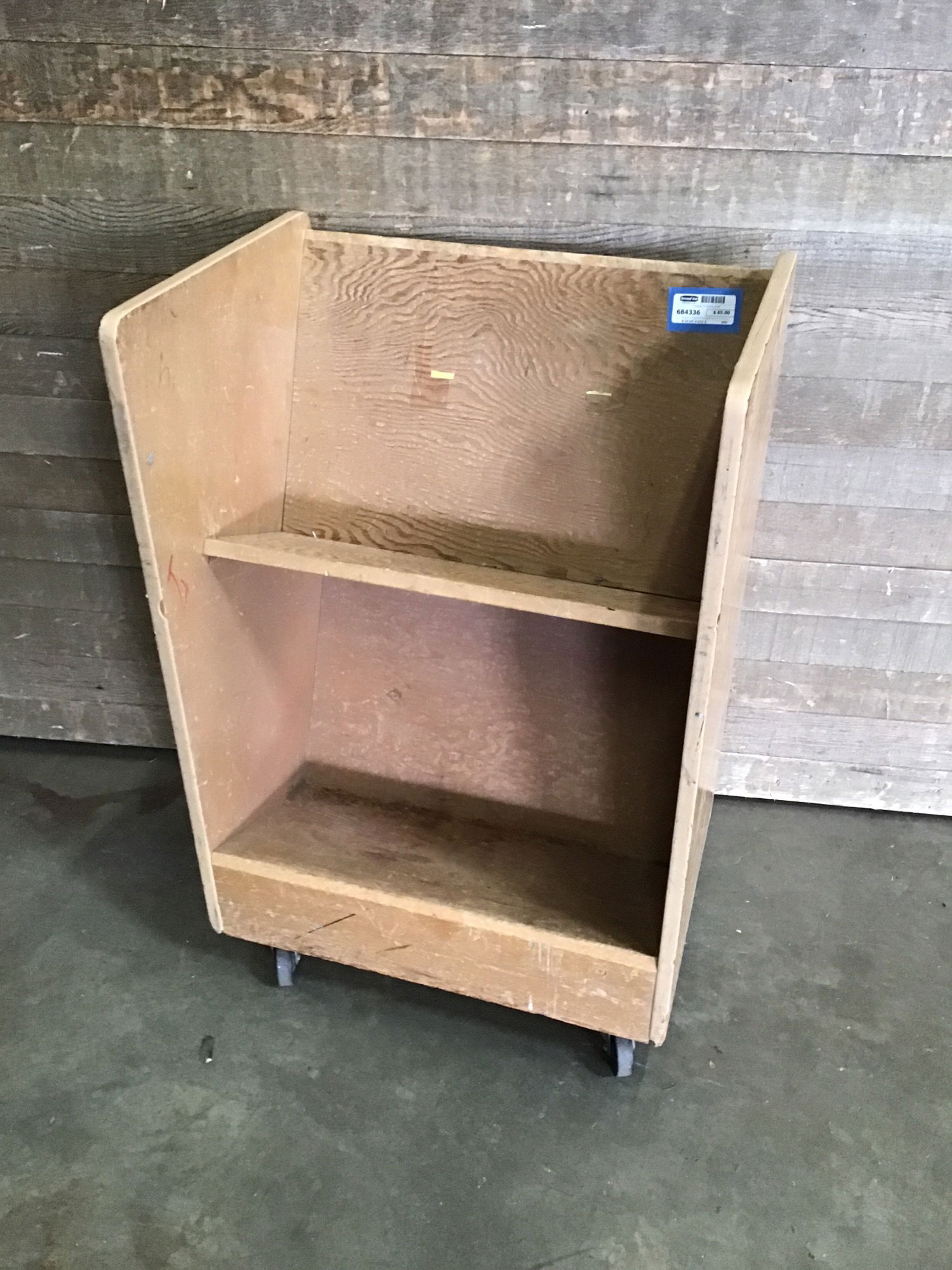 Vintage Fir rolling shelf with angled shelving for storing books, movies, records, or whatever you can think of!