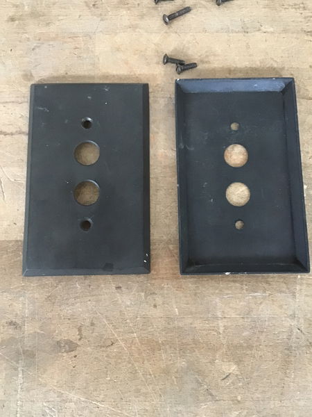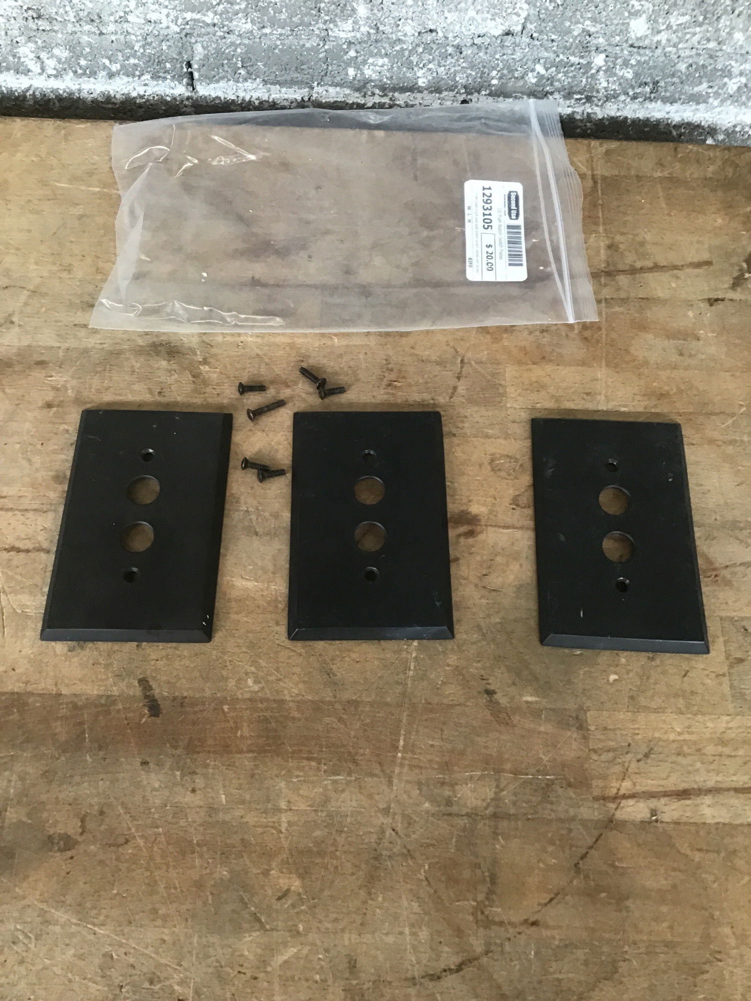 Three brass single pole push-button switch plates with screws and an oil rubbed bronze finish.