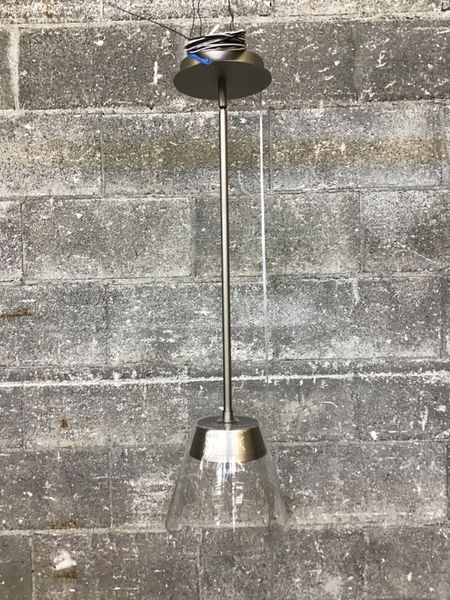 WAC brand 'Chandra' 8" mini LED pendant with nickel finish and clear glass shade. This includes additional 12" stems for height adjustment flexibility and it can pivot at the canopy for a sloped ceiling. Bulk item, no holds, first come, first served. See it retailing here.