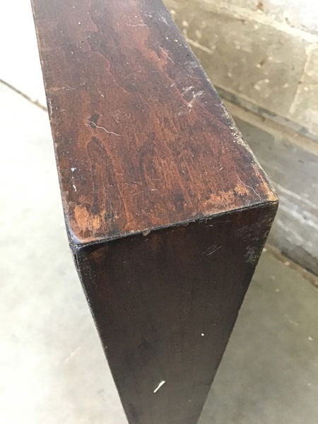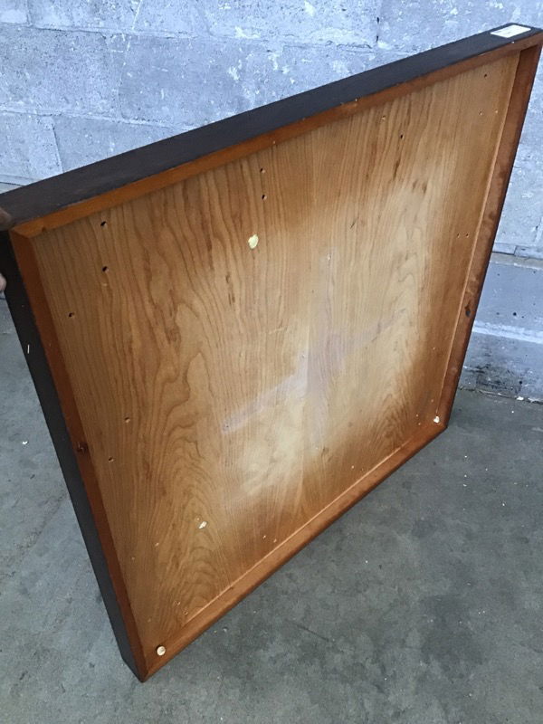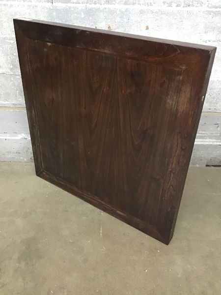 Stained, mixed grain-maybe Cherry and Walnut plywood?-square cafe table top, great for your new cafe or as a kitchen table, we may even have some options for bases here. Built to last, use as-is or sand it down for a fresh start. Photo may be representational.