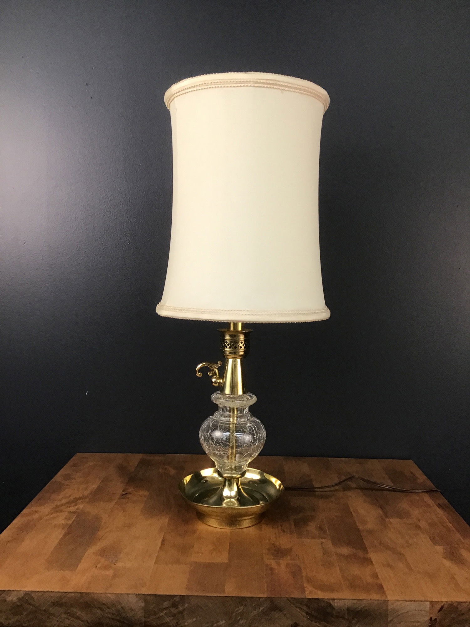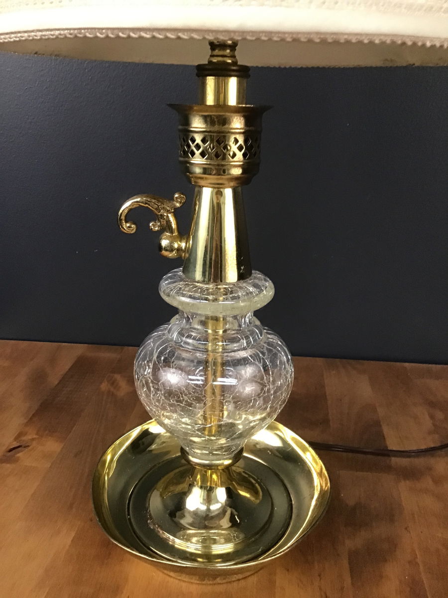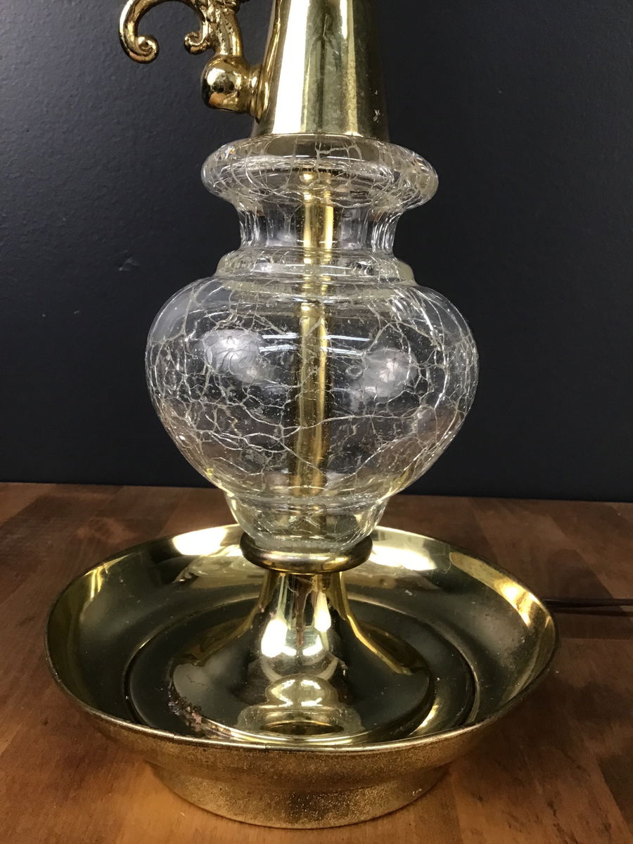 1960s table lamp with gold and crackled glass with 9.25" diameter shade; restored/rewired by our lighting repair workshop. Small dent in base considered in pricing.