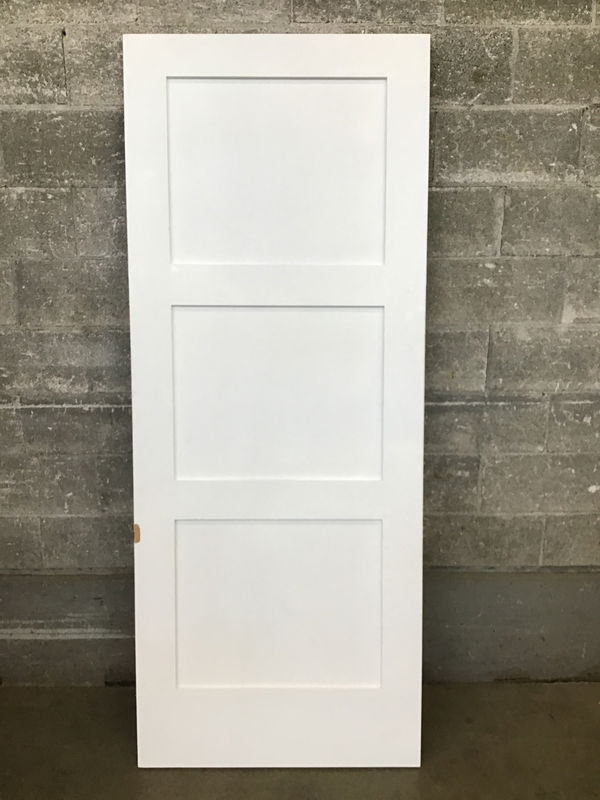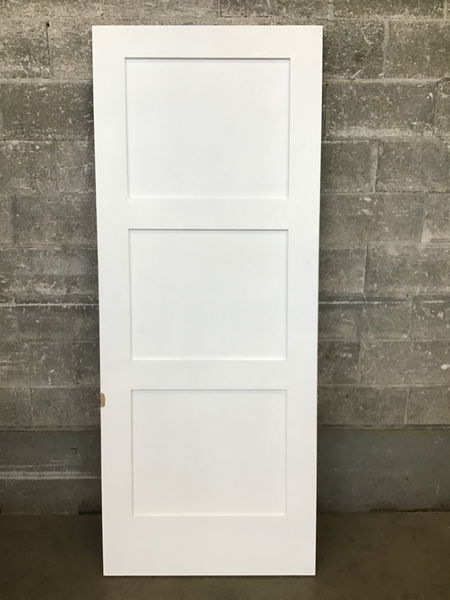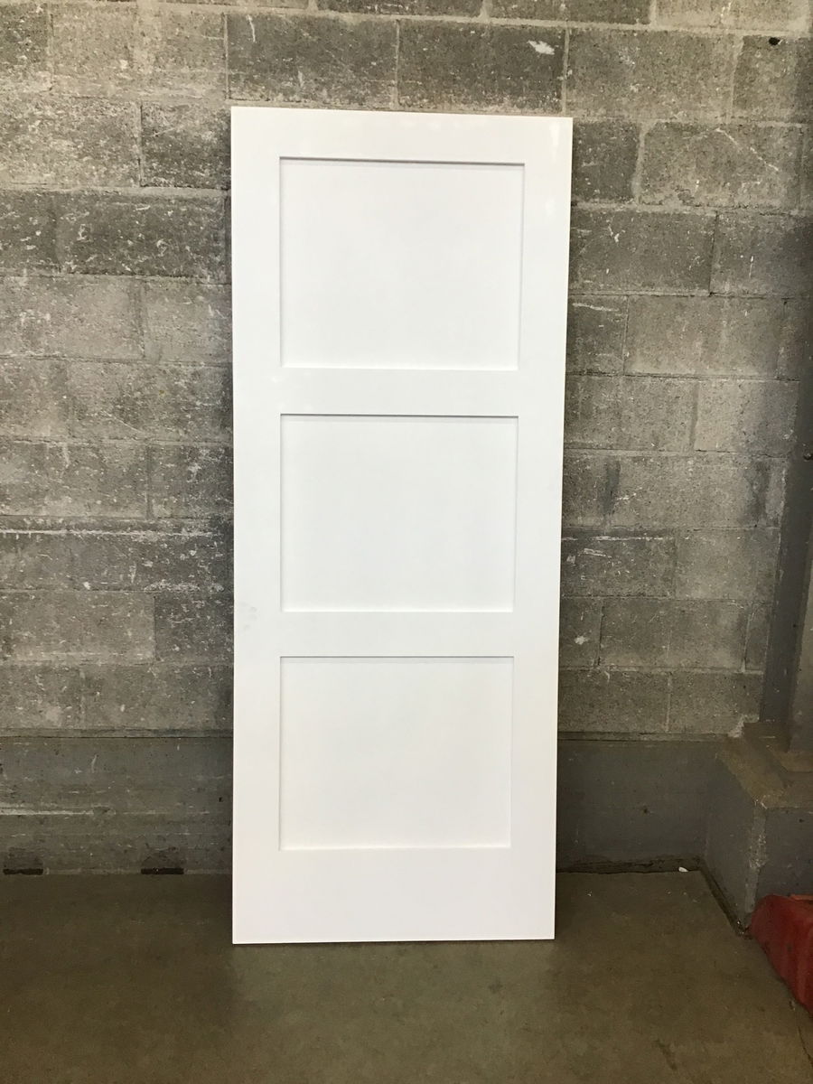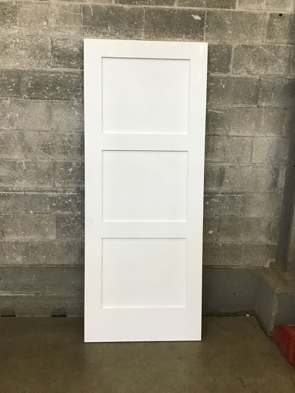 Never installed, primed masonite, Shaker style three panel interior door. This one has some fork tip damage on one edge. Price reflects. Item may have cosmetic damage.