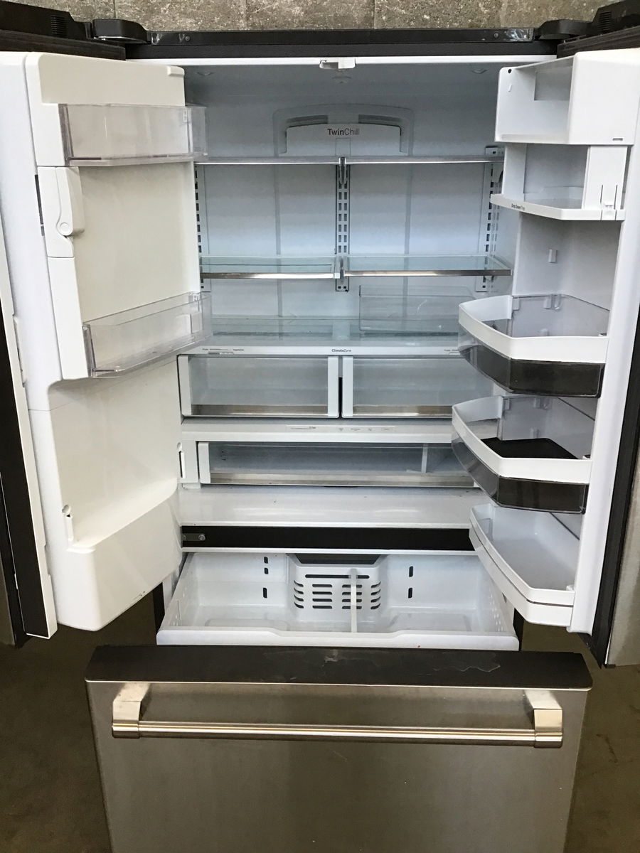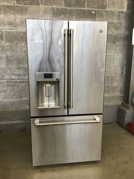 GE Cafe Refrigerator that dispenses both cold and hot water on the front! So neat! The stainless exterior is free of cosmetic damage and inside is clean enough. Tbh this thing as so many little bells and whistles you should check out it's product specs here. This item was tested in our receiving department and appears functional.