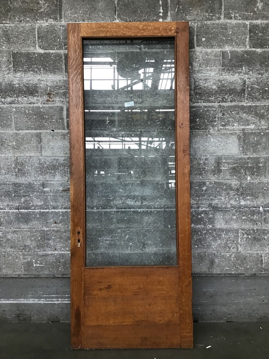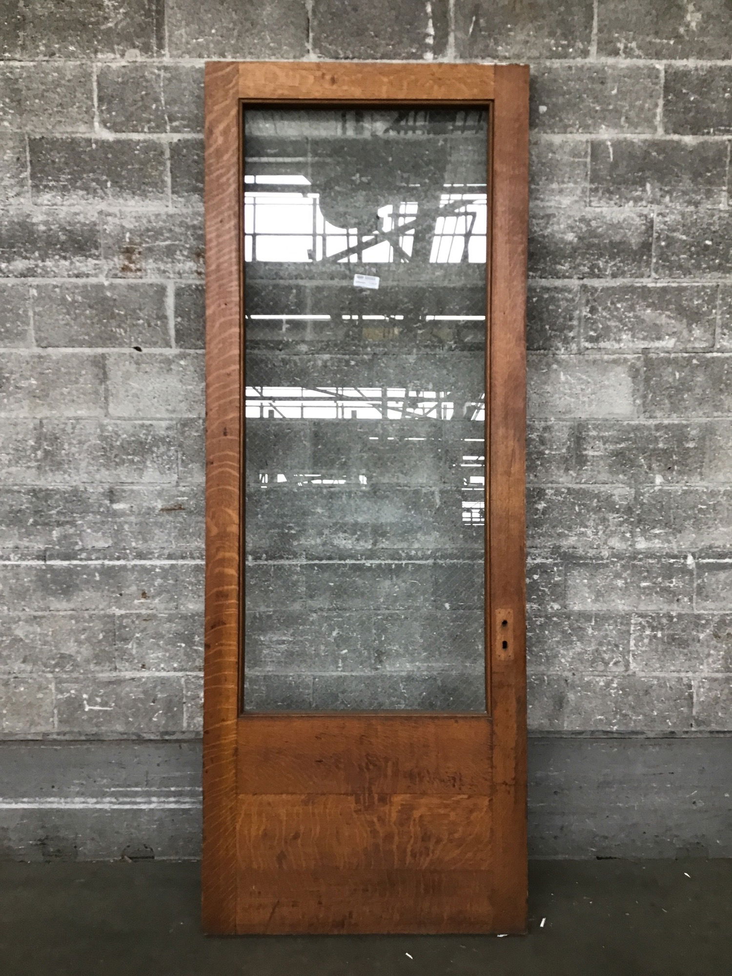 3' x 8' Vintage white oak full (or almost more like 3/4) lite with single pane, square mesh style safety glass. Looks like the quarter sawn, tiger stripe veneer is at least 1/4" thick if you feel the need to sand it, but it has a nice patina just as it sits. Note thickness. I'm guessing this is a lumber core door. and it probably could be shortened.