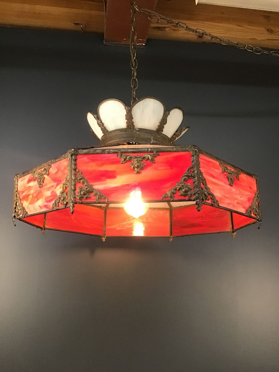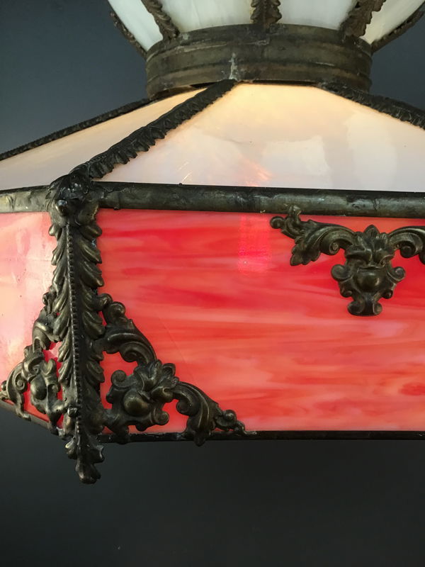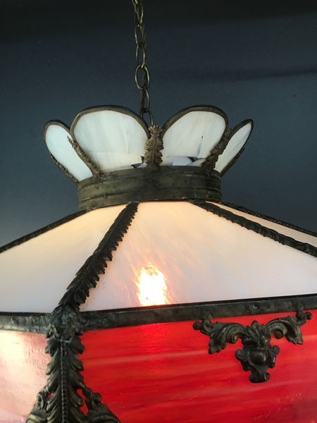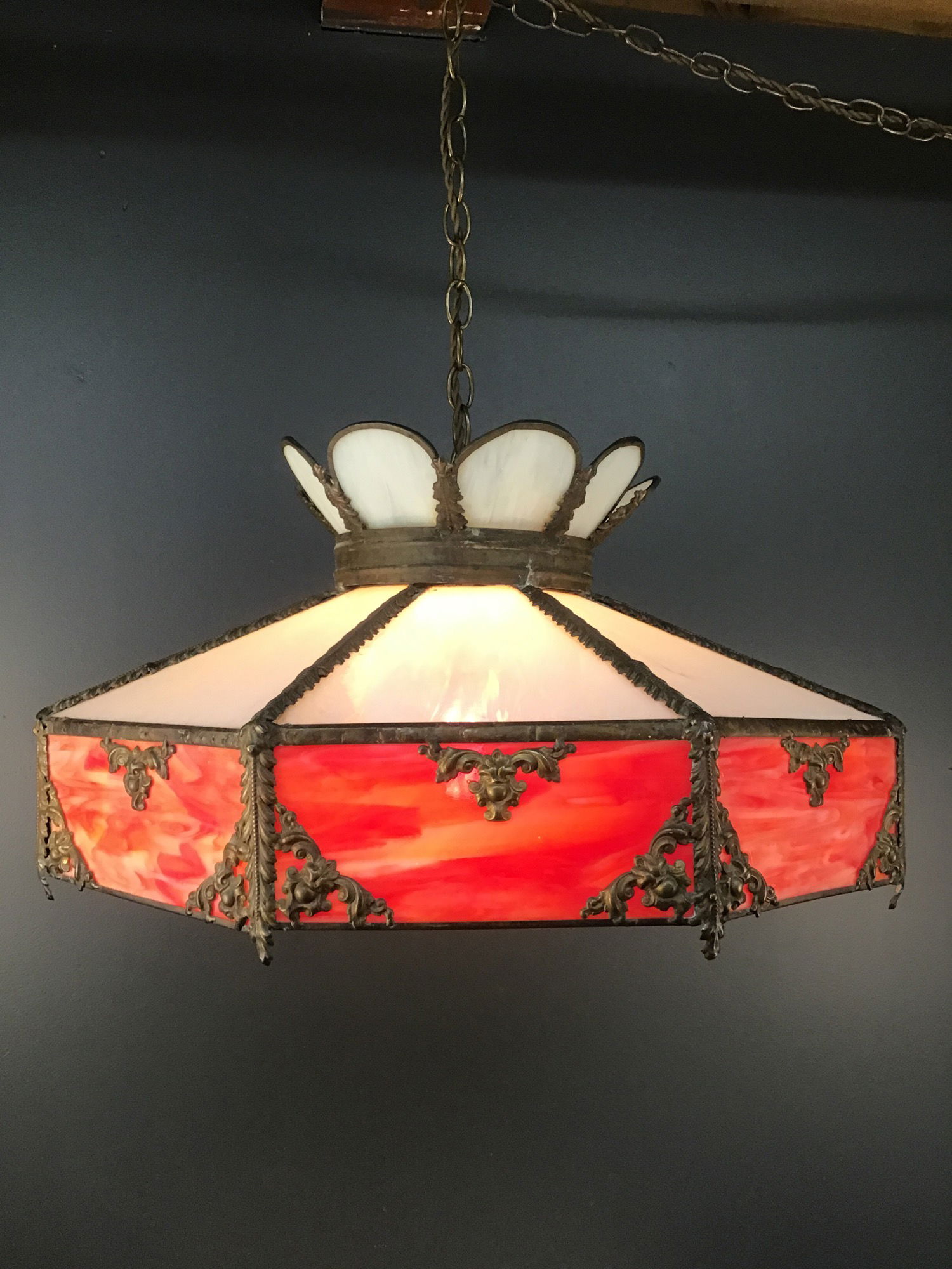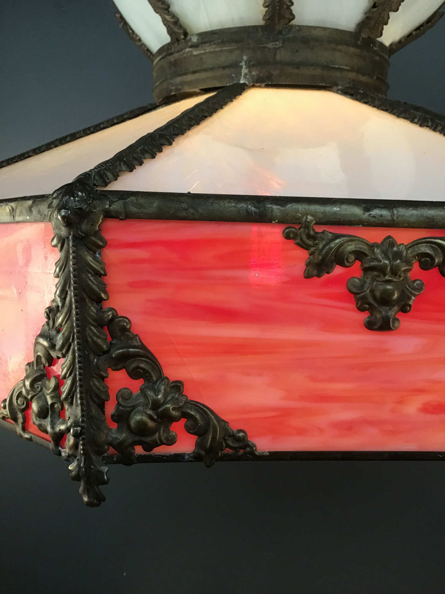 An antique red and white slag glass panel shade with brass accents hangs from 14' of antique style twisted rayon covered cord. Has a plug and pull chain socket. Some of the panels are bent, broken and mended, but this is still a gorgeous old girl! Damage was considered in the pricing. Rewired in our on site light repair workshop.