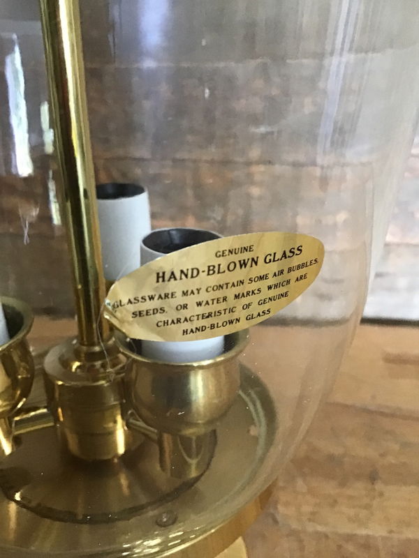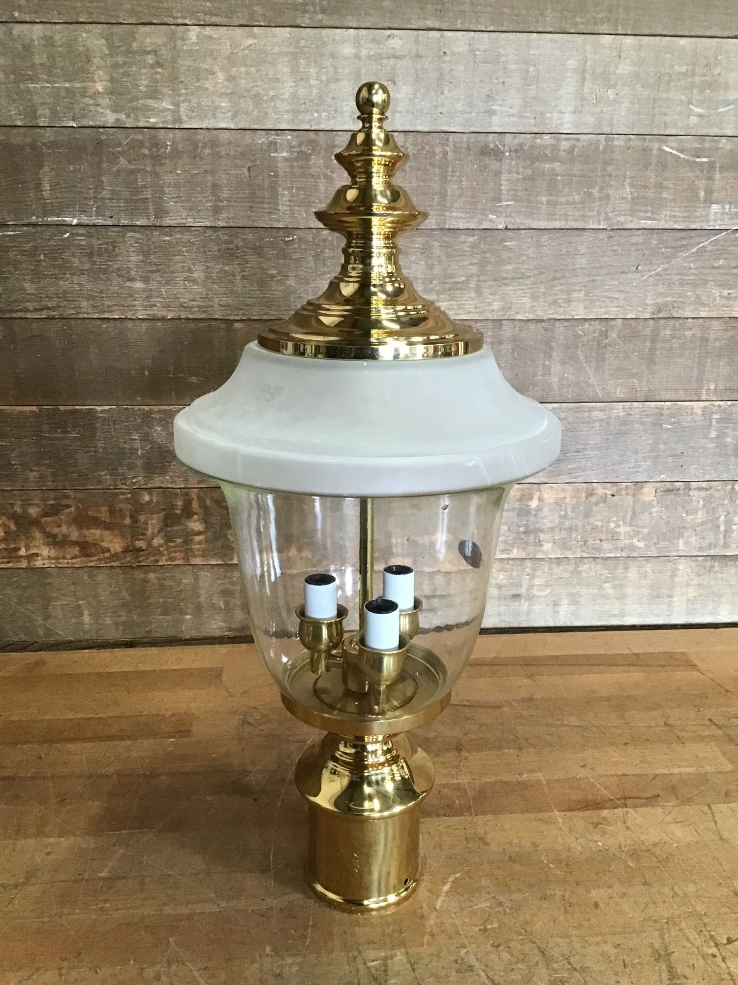 Post light with a hand blown clear glass shade with a frosted glass cap in excellent condition. The fixture has a shiny brass finish. Looks like it has never been permanently installed. Suitable for damp locations, for metal post mount only. .