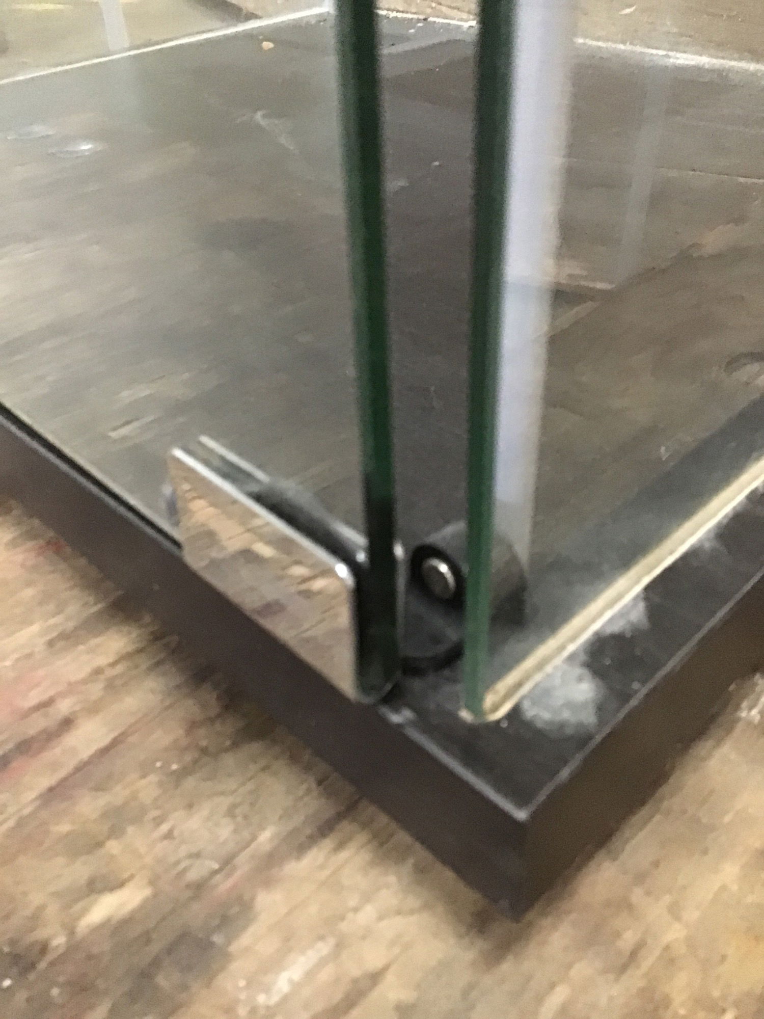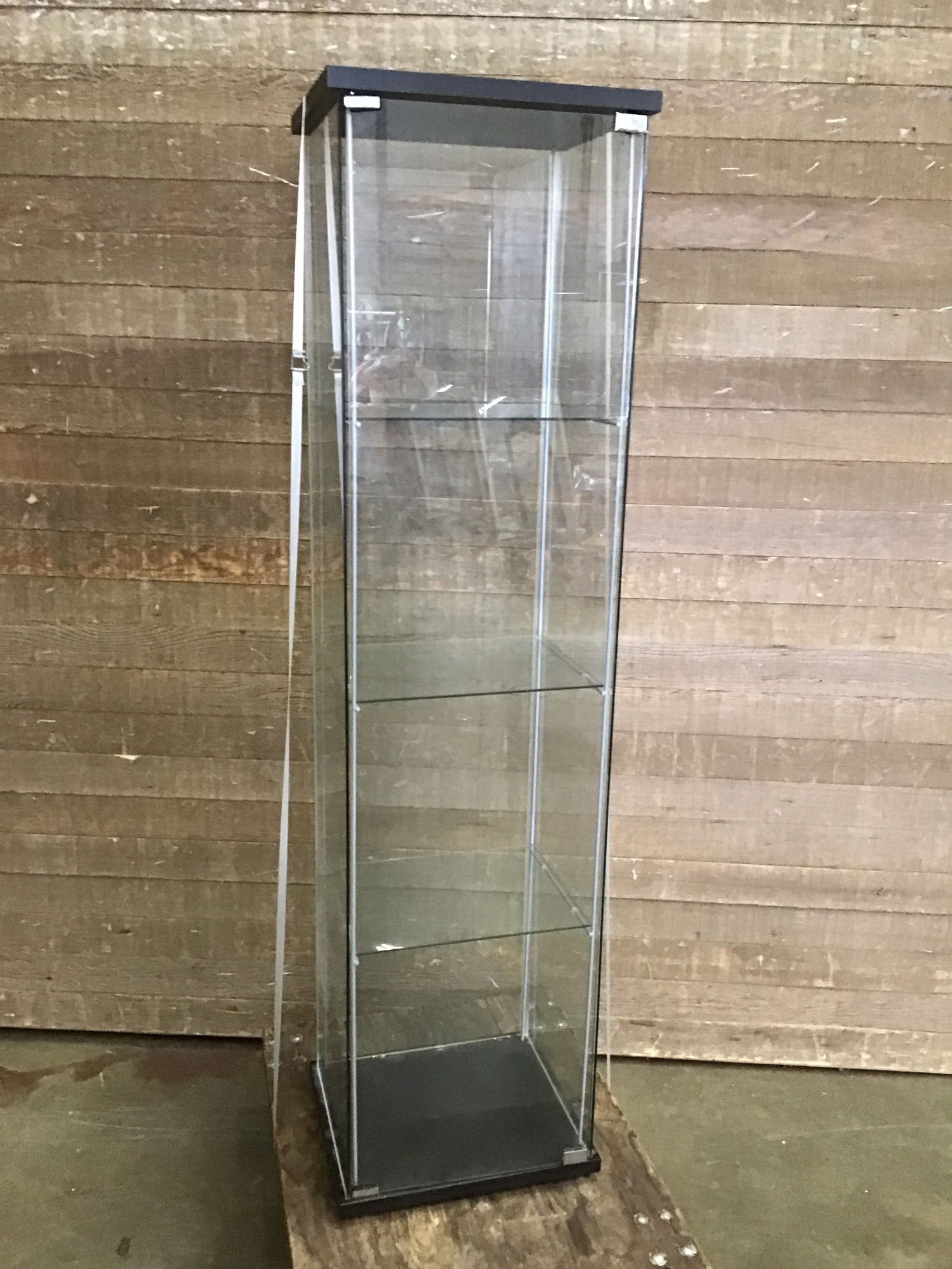 Glass Display Case with three fixed glass shelves and a Black MDF top and bottom. Perfect for humidity loving plants, or displaying your favorite art or knick knack pieces. The door doesn't want to close all the way, but it likely just needs the hardware fiddled with.
