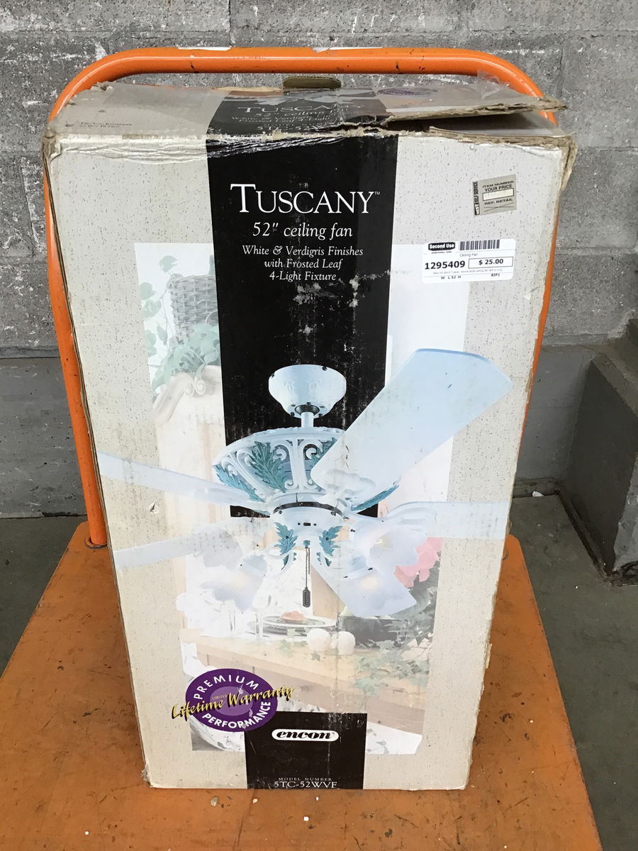 New old stock Tuscan revival style ceiling fan still in original packaging. Appears complete and ready for installation.