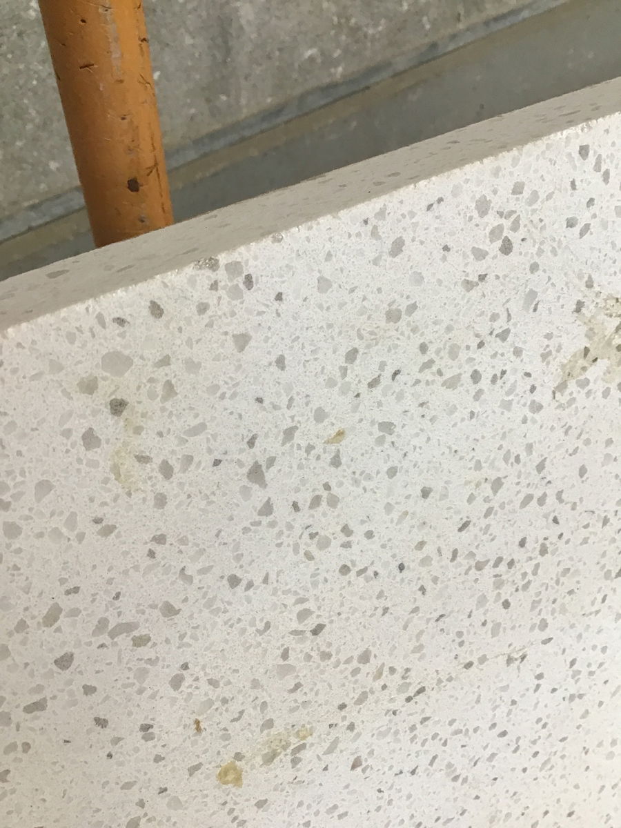 White man-made countertop chunk. Does not have any finished edges and the top is not sealed. Listed measurements reflect the size of the piece when the damaged corner is squared off. Project chunk!