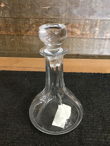 Sweet little glass decanter with scalloped indents around the base and a little cupped stopper. Not labeled as glass or crystal.