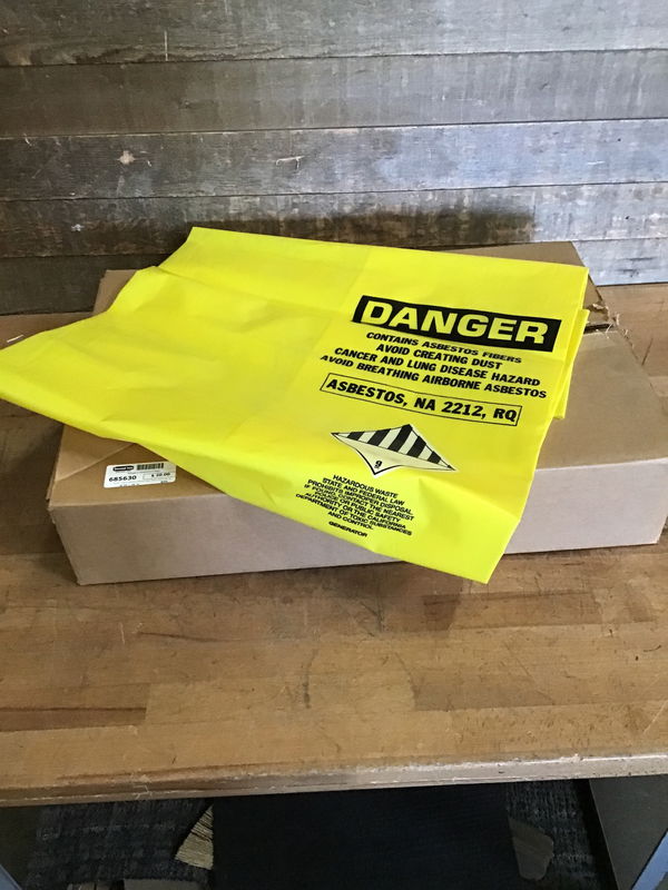 33x49" .006mil asbestos disposal bags. Bright yellow with warning labels and all the legal stuff. Box full of them.