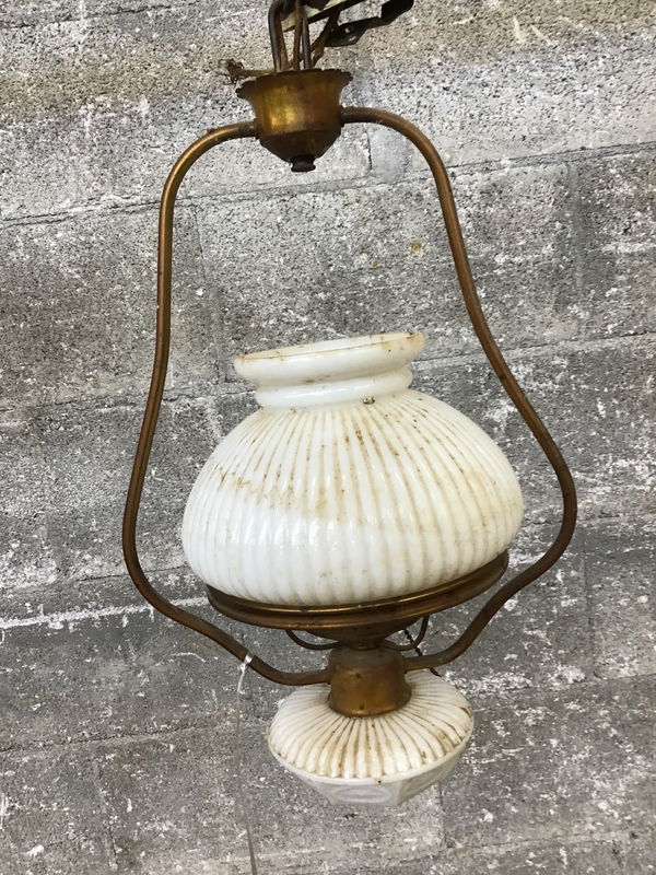 Vintage milk glass lantern-like light with a pull chain and decorative pressed motifs on the bottom glass section. Would make a lovely addition to a period home.