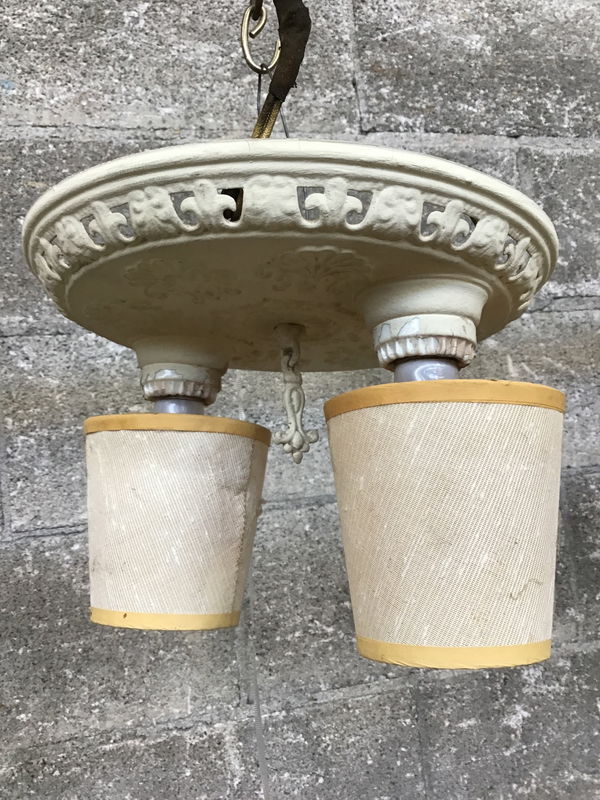 Vintage pan light with two bulbs and teeny fabric shades for each. Has been through a paint job but would make a fun project for the right restorer.