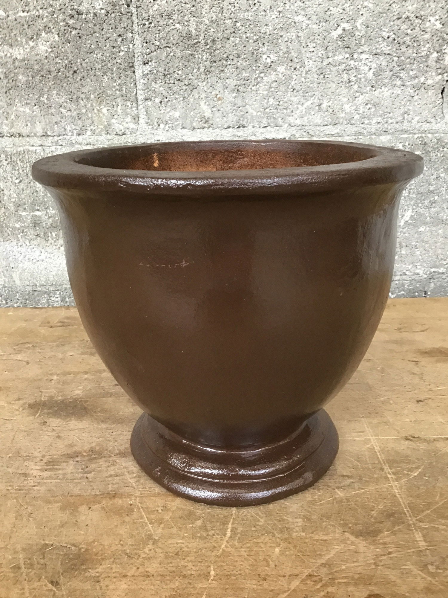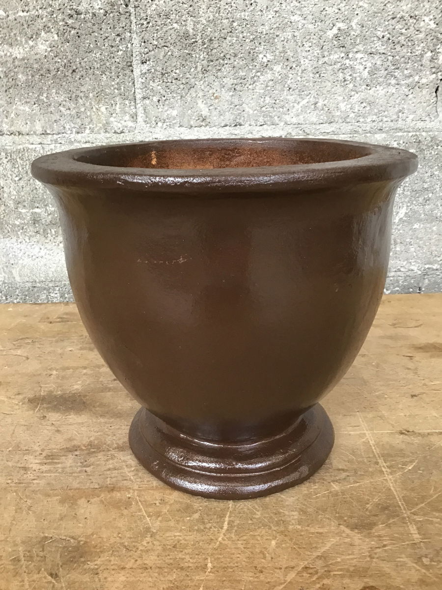 Round terracotta planter with decorative foot. Has been painted brown.