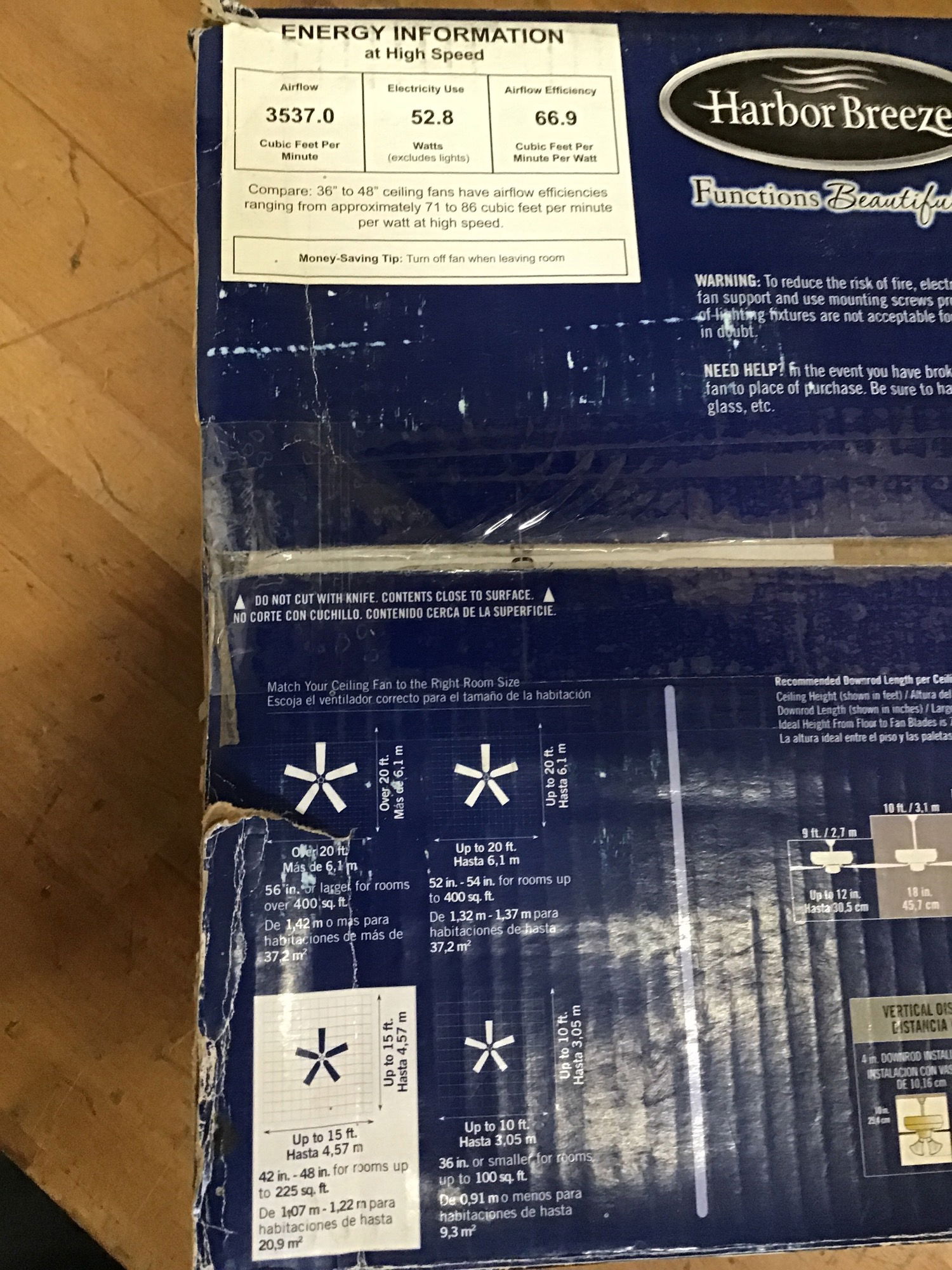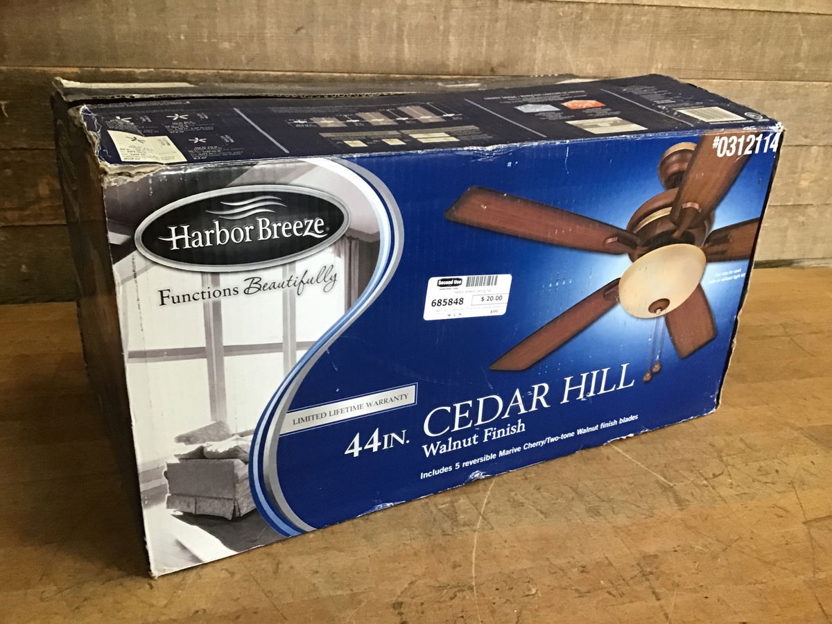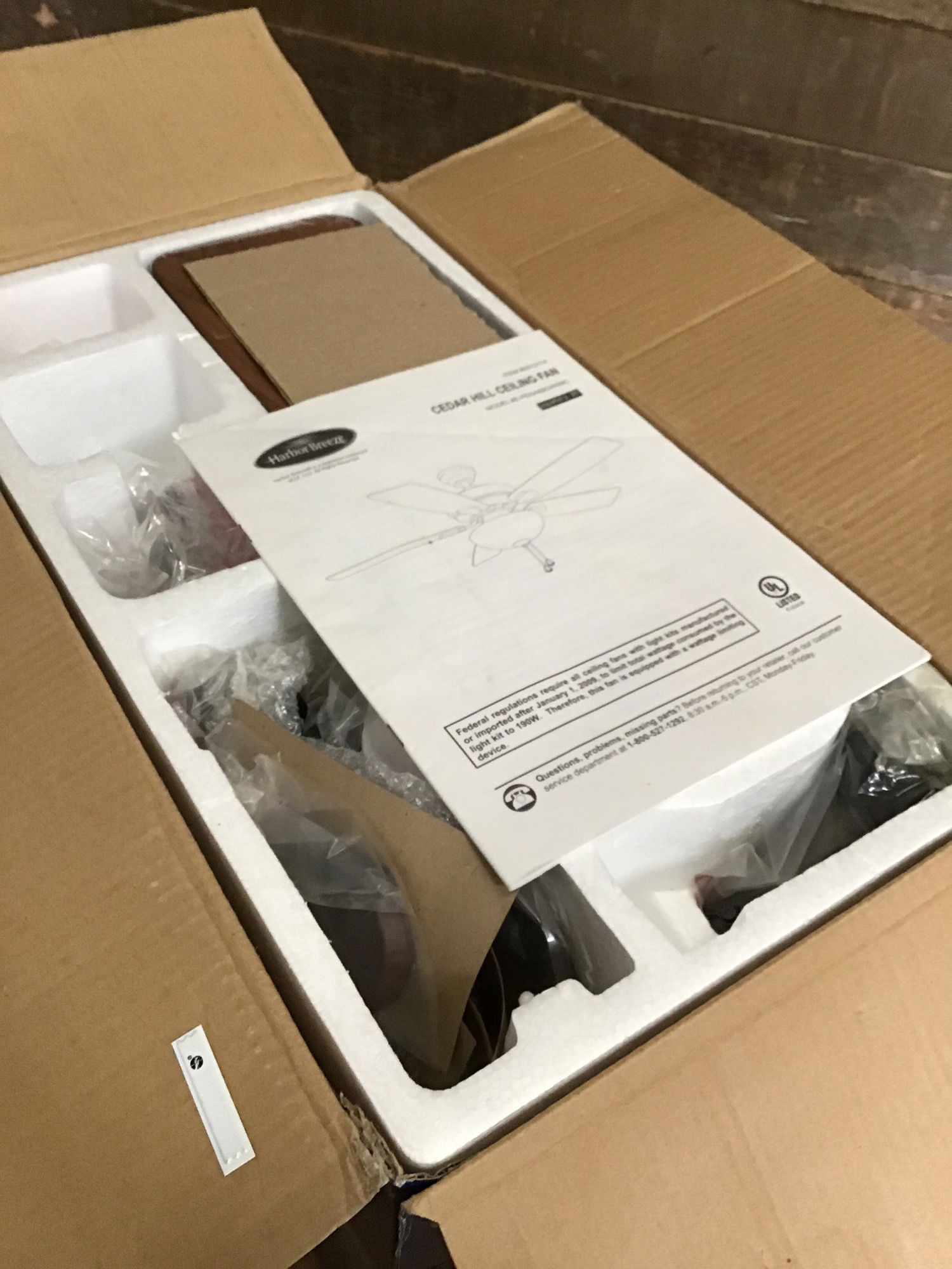 New in box, 5 blade Cedar hill ceiling fan model #e-pen44bcw5mc. No parts missing.