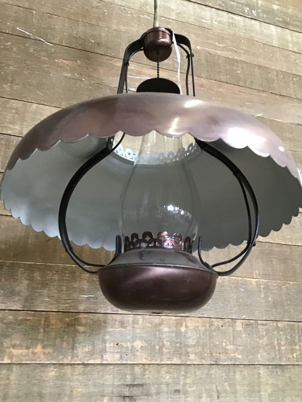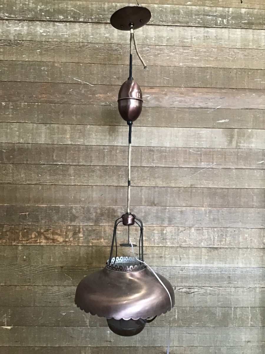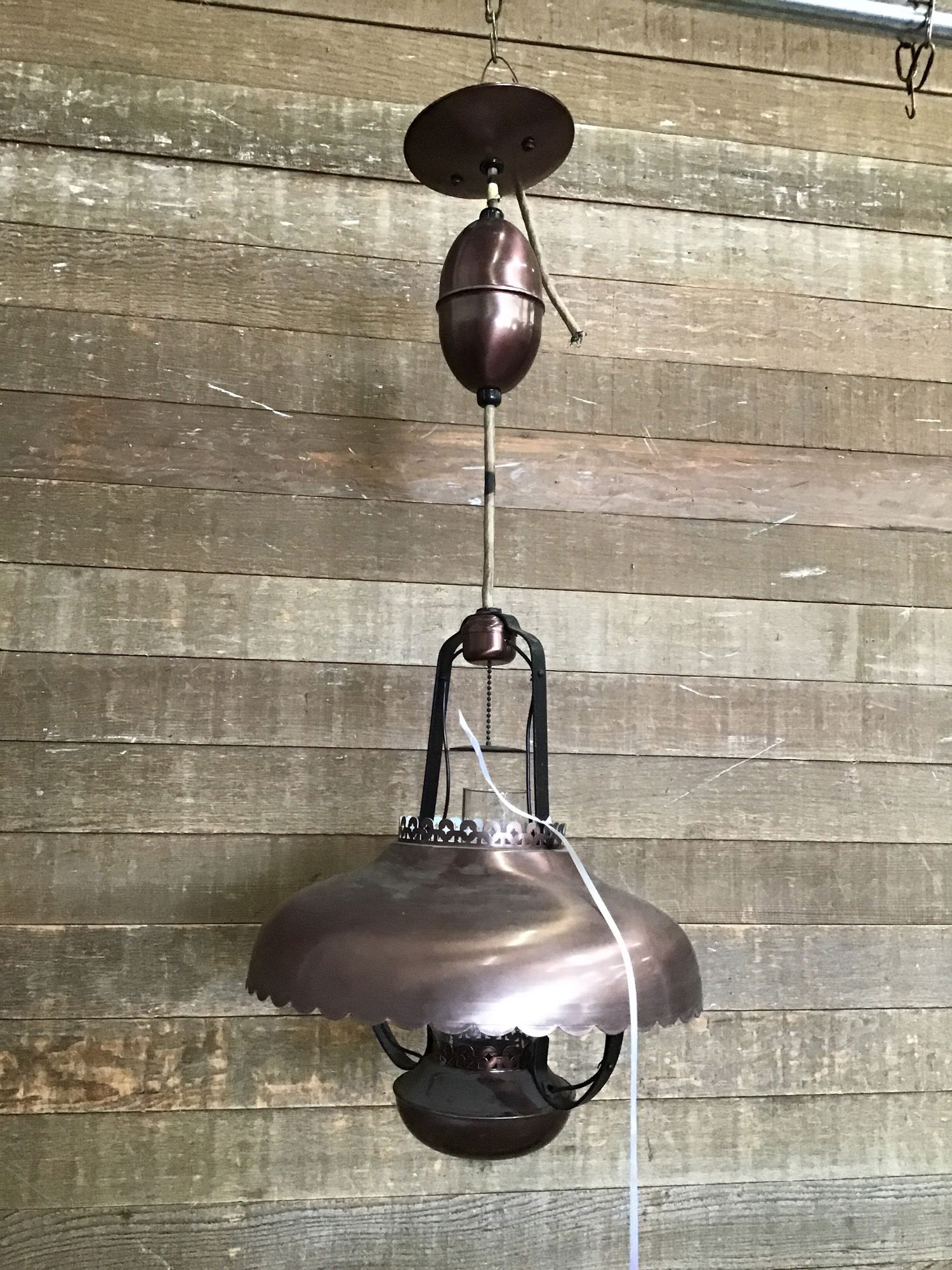 Vintage Sears pull down light with an antique copper finish. The pull down mechanism works as it should, and it includes the glass chimney. Could you a good clean, but wiring looks good. We always recommend a full test prior to installation.