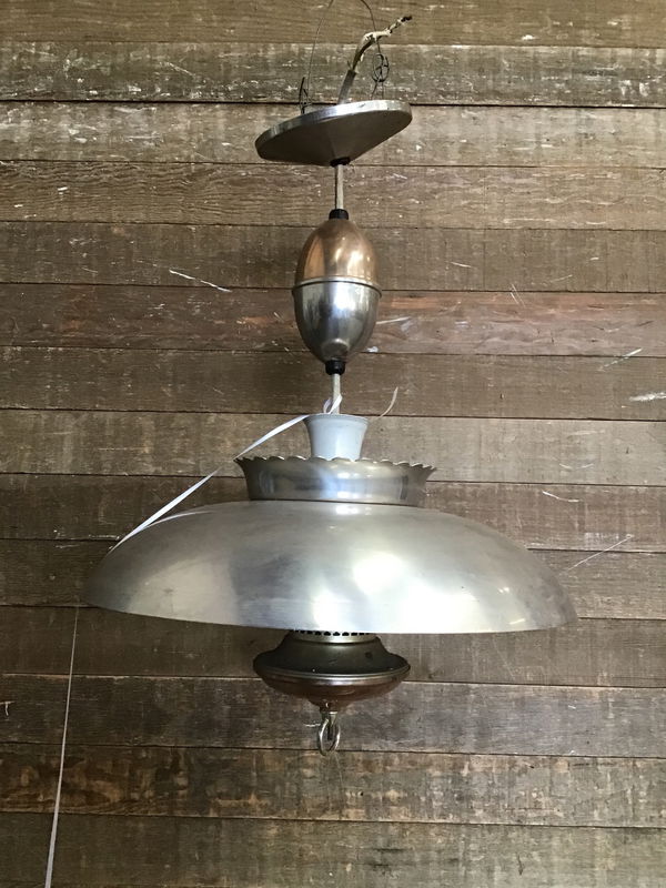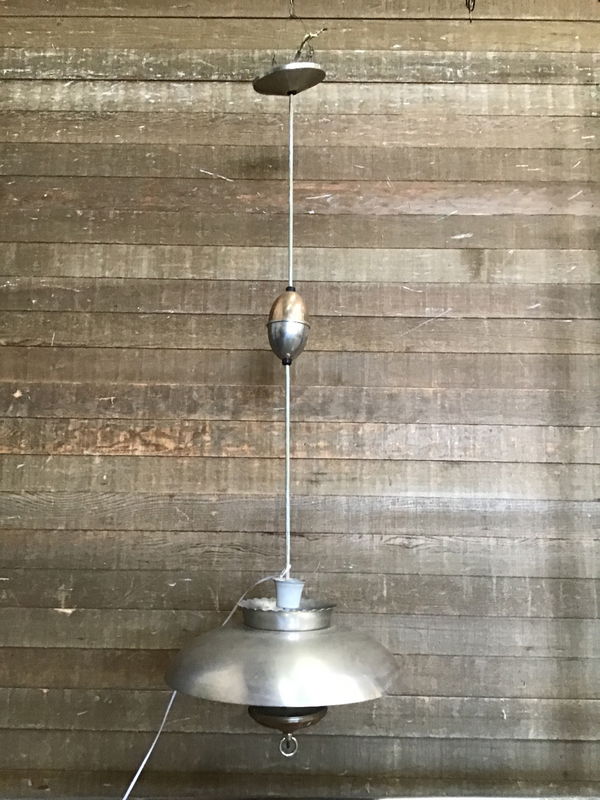 Vintage Sears pull down light with an antique copper finish and a brushed steel finish. The pull down mechanism works as it should. This takes three standard bulbs. Could you a good clean, but wiring looks good. We always recommend a full test prior to installation. Height listed is at shortest length