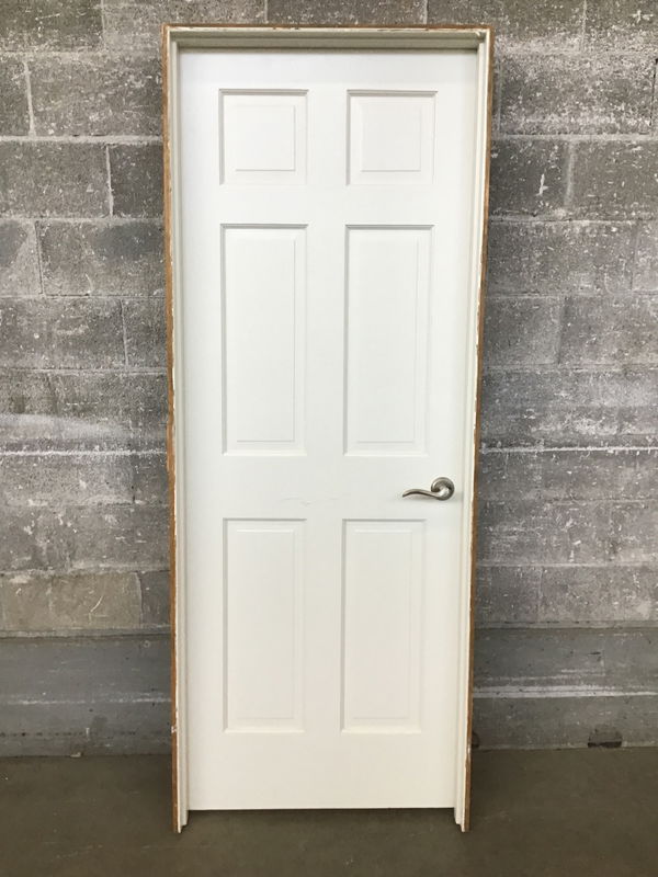 Pre hung, white, six panel interior door with brushed nickel lever handle. Some cosmetic imperfections may be present but door is in good shape overall.