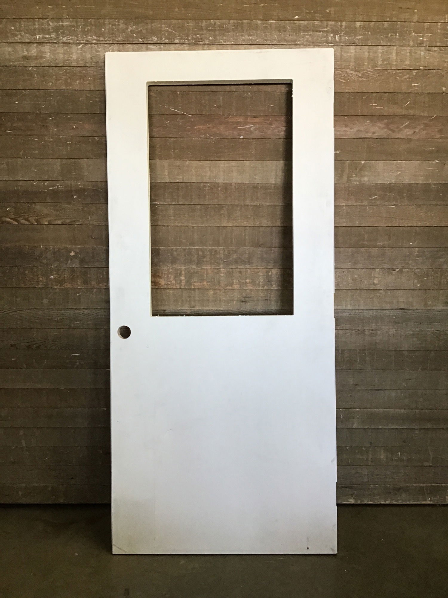 Fiberglass clad exterior half lite door, missing the glass portion. Replace it with a pane or some plexiglass for a great deal on an exterior door.