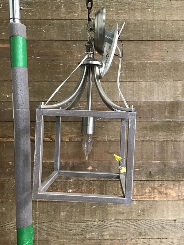 Hanging light with a faux weathered finish cage attached to a brushed nickel finish body with a single light. Nice little light for setting up some mood lighting.