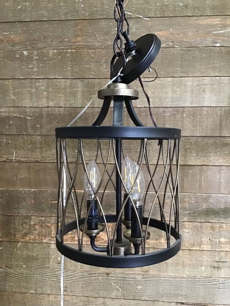 3 light black with gold tone French country drum cage hanging light. By Kichler Lighting.