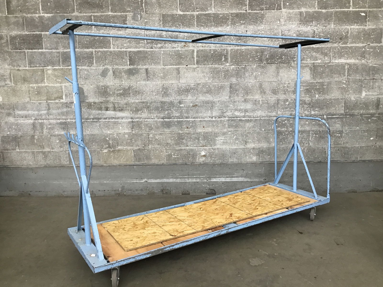 Spacious steel rolling coat rack, could be great for a clothes or plant shop!